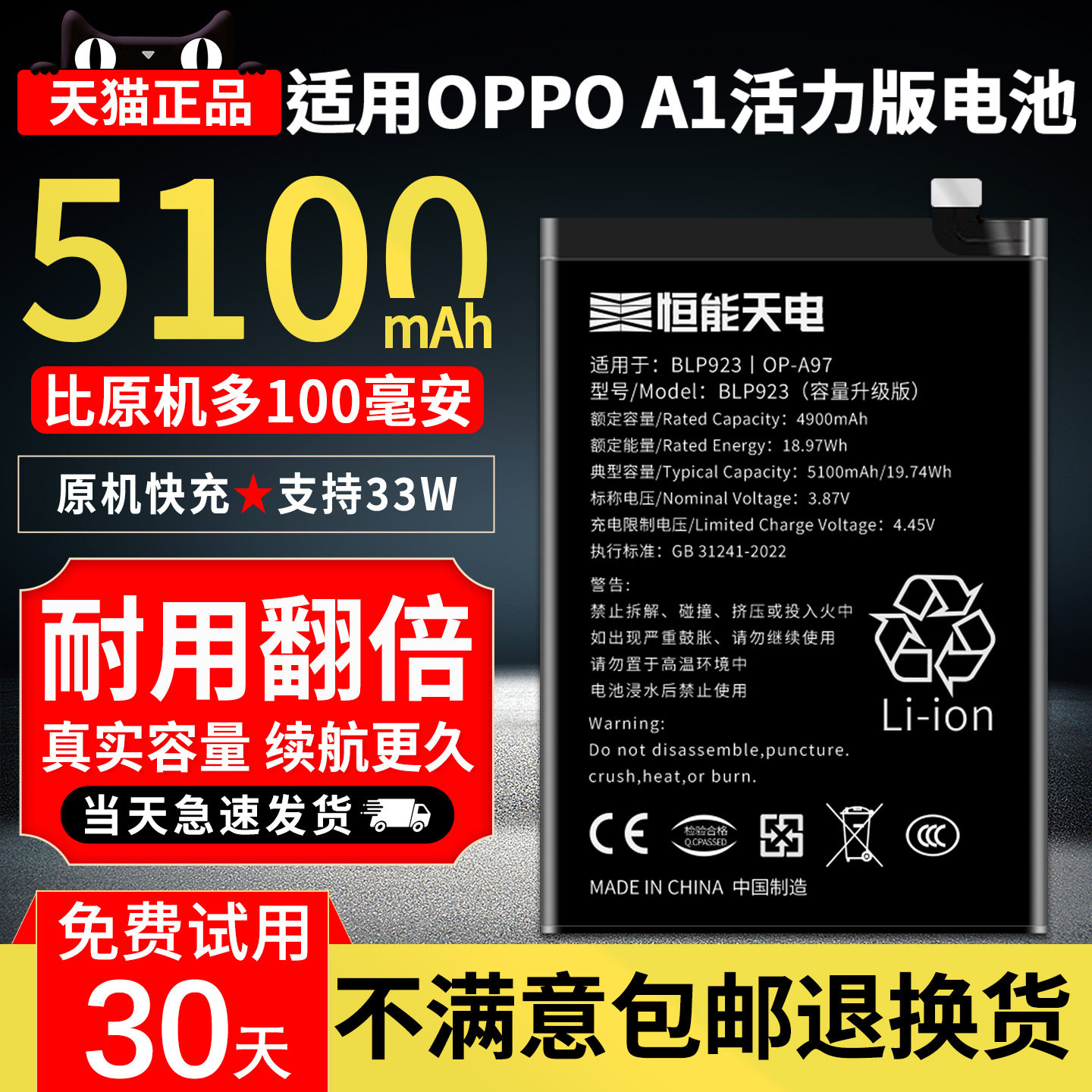 📚 恒能天电官方正品适用【OPPO A1活力版电池】oppoa1超大容量更换原手机PHJ110快充电芯装扩容内置魔改BLP923