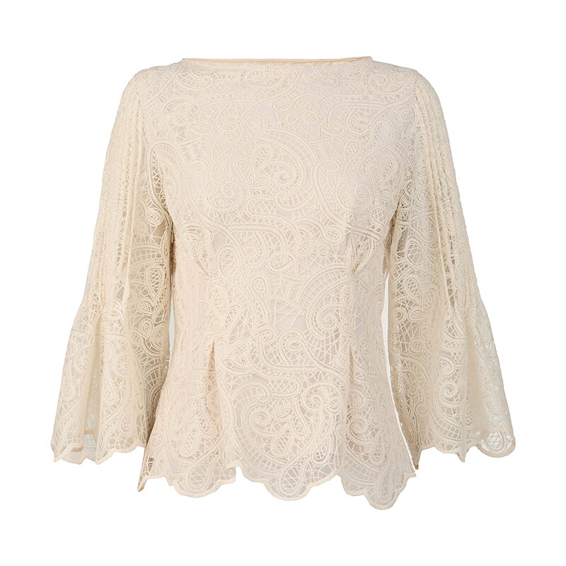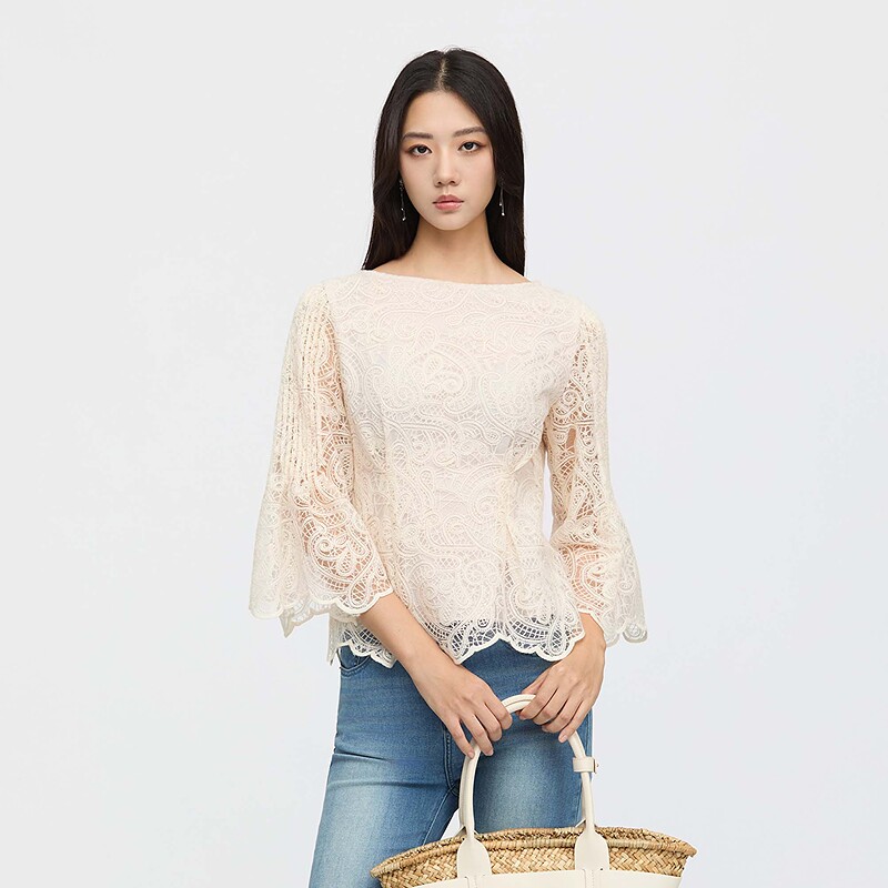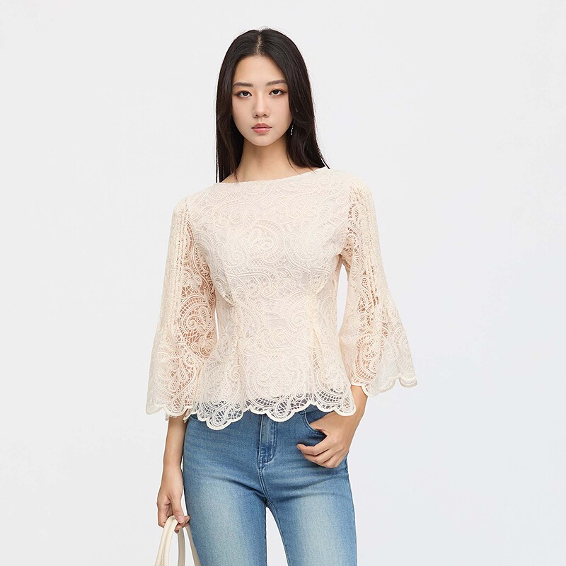 📚 sdeer圣迪奥女装25新品复古圆领镂空绣花喇叭袖上衣S253Z3205
