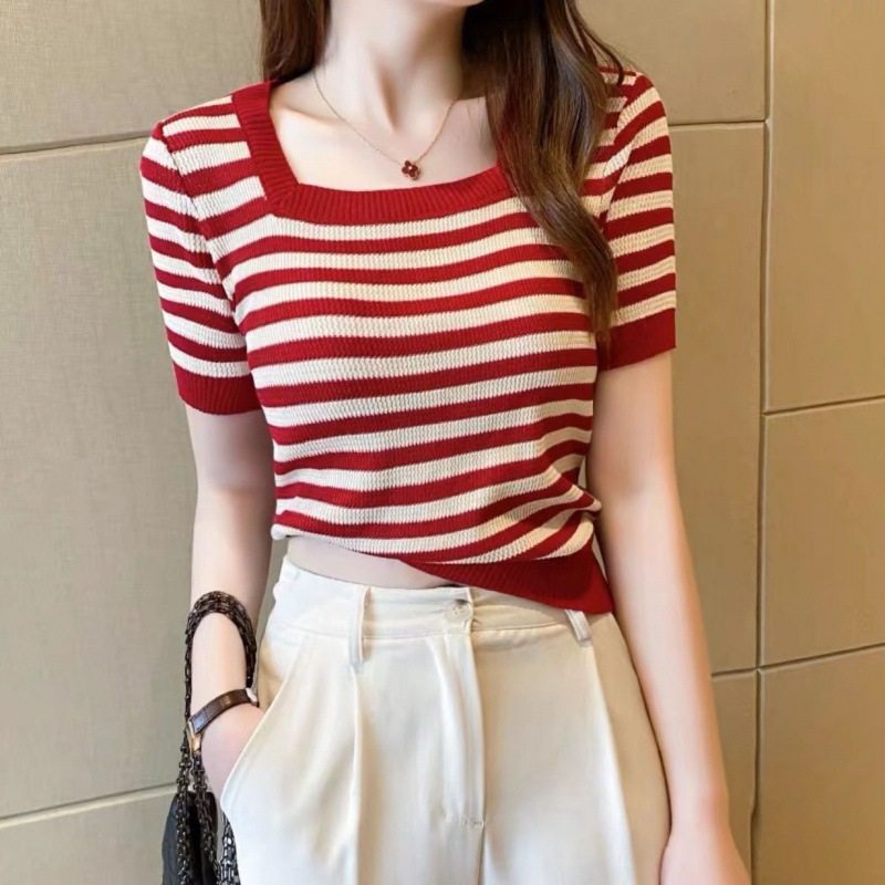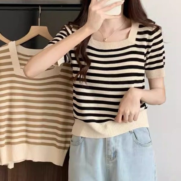📚 Striped knitted fabric square-neck T-shirt 条纹针织款方领T恤