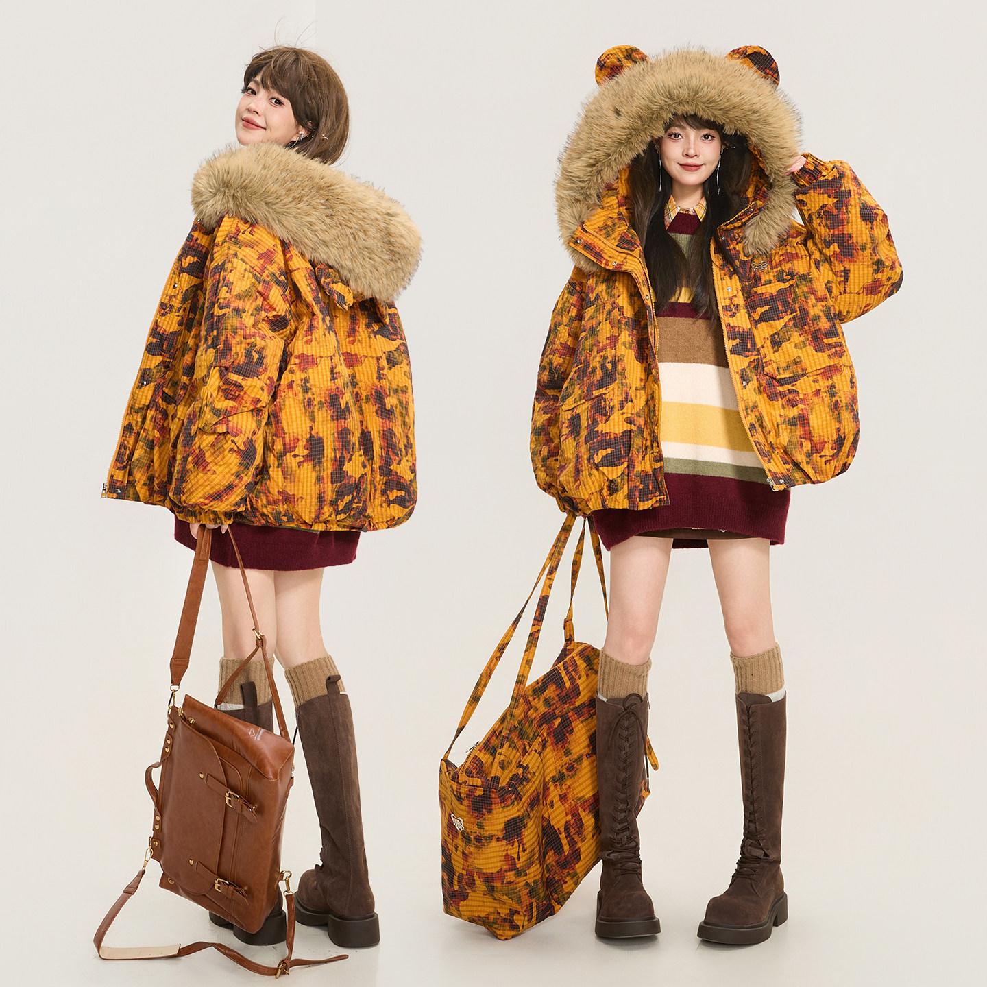 📚 KEIKO 日系复古大毛领连帽迷彩棉服25冬季加厚保暖外套短款面包服