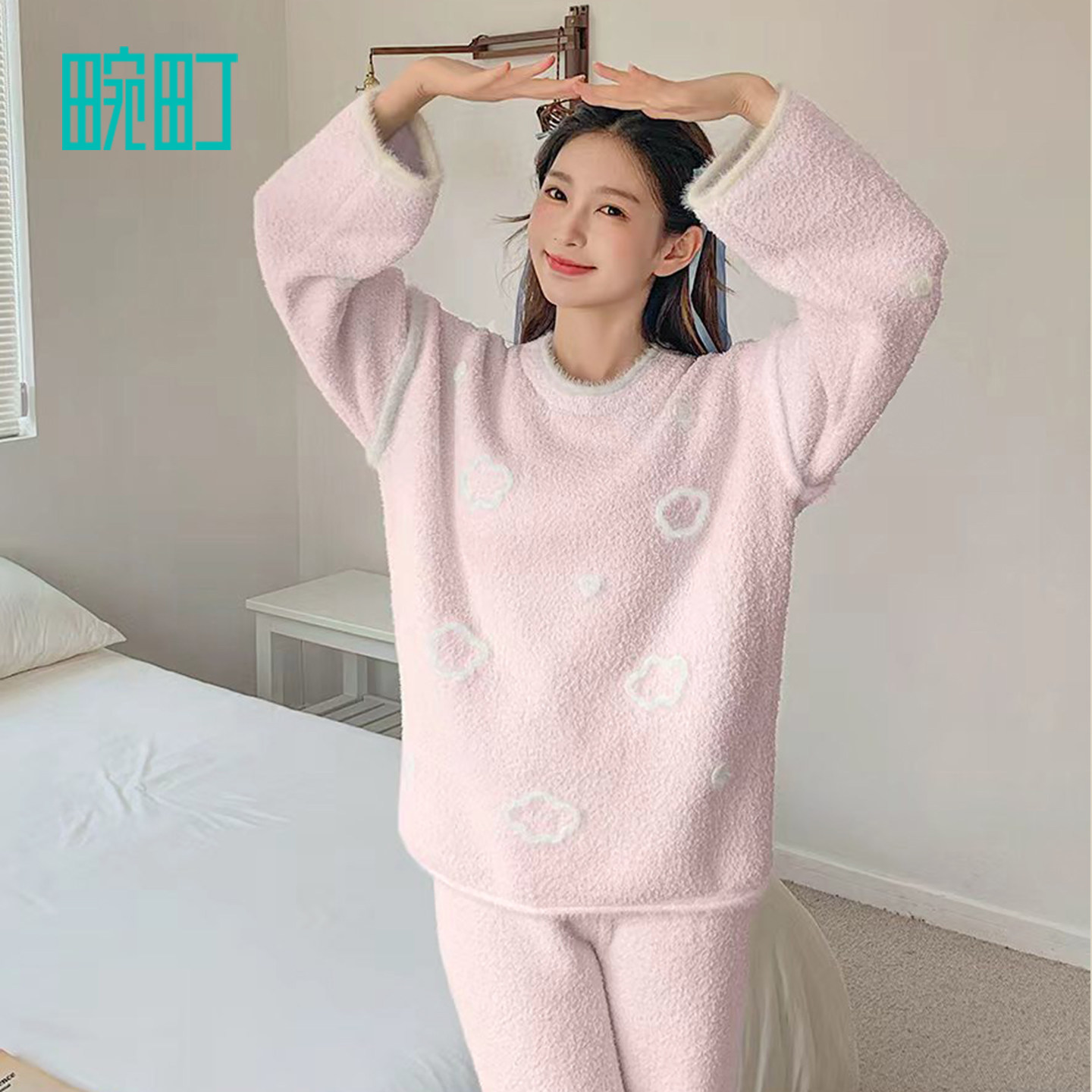 📚 畹町半边绒睡衣女冬季保暖条纹开衫外套吊带长裤三件套家居服套装