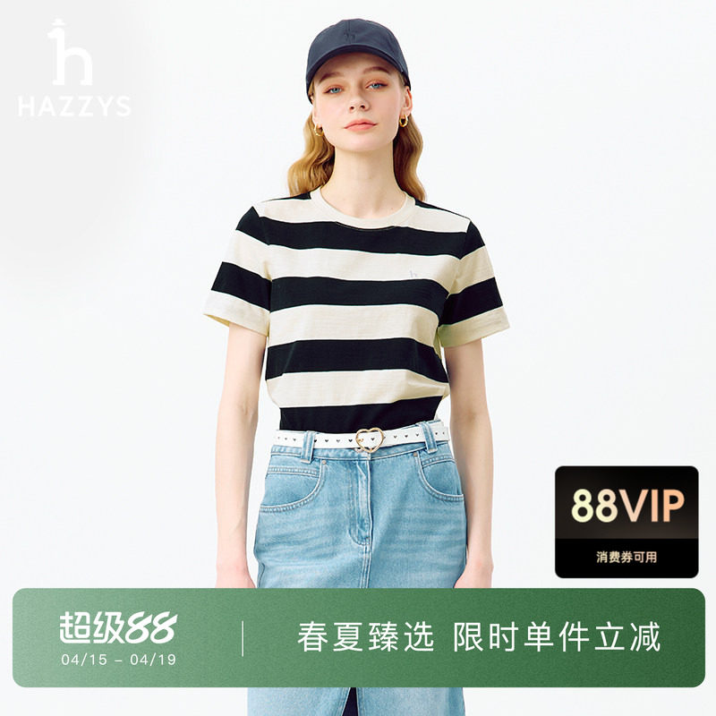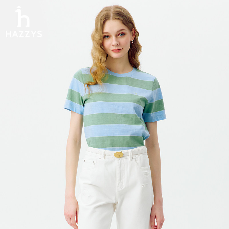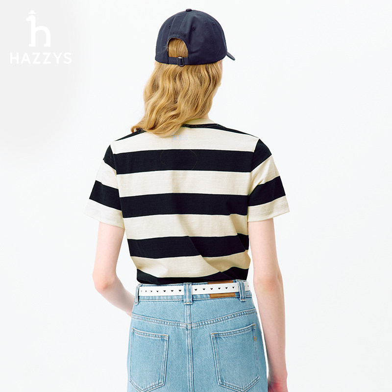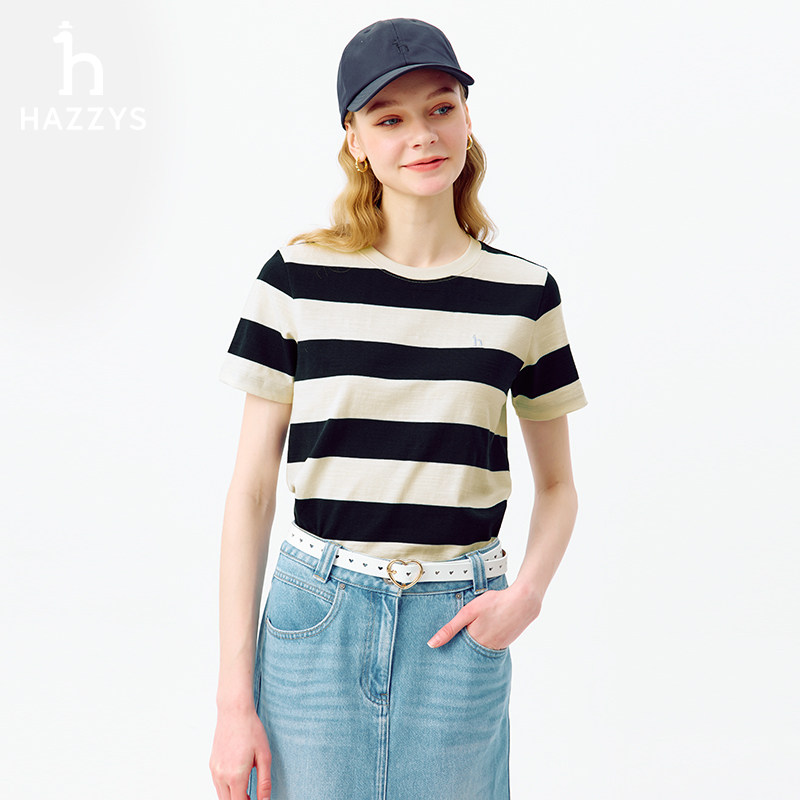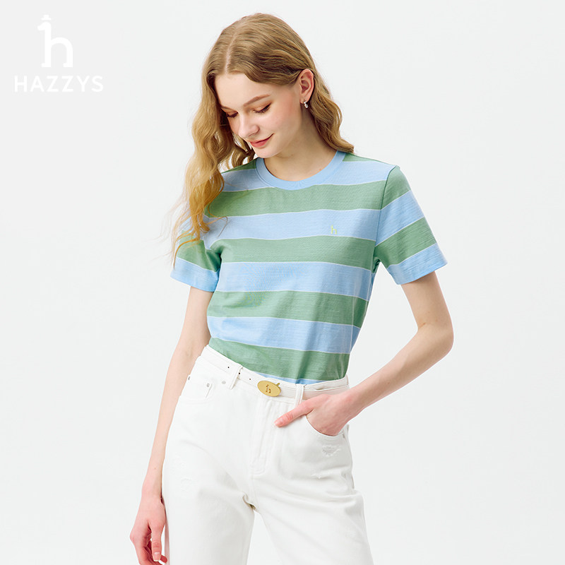 📚 Hazzys哈吉斯横条纹宽松圆领T恤女士休闲通勤短袖活力纯棉上衣