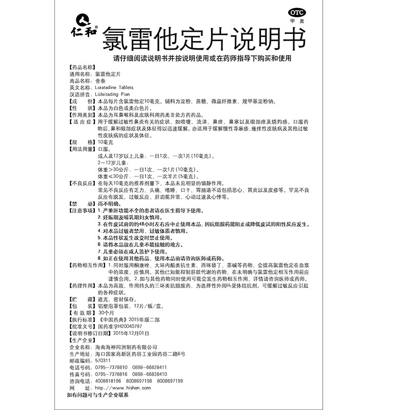 📚 仁和 氯雷他定片12片/盒慢性荨麻疹其他过敏性皮肤病过敏性鼻炎药