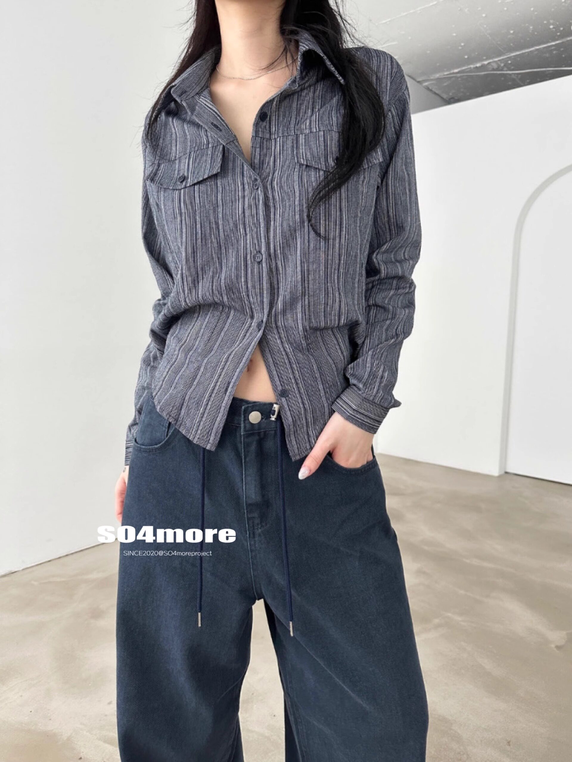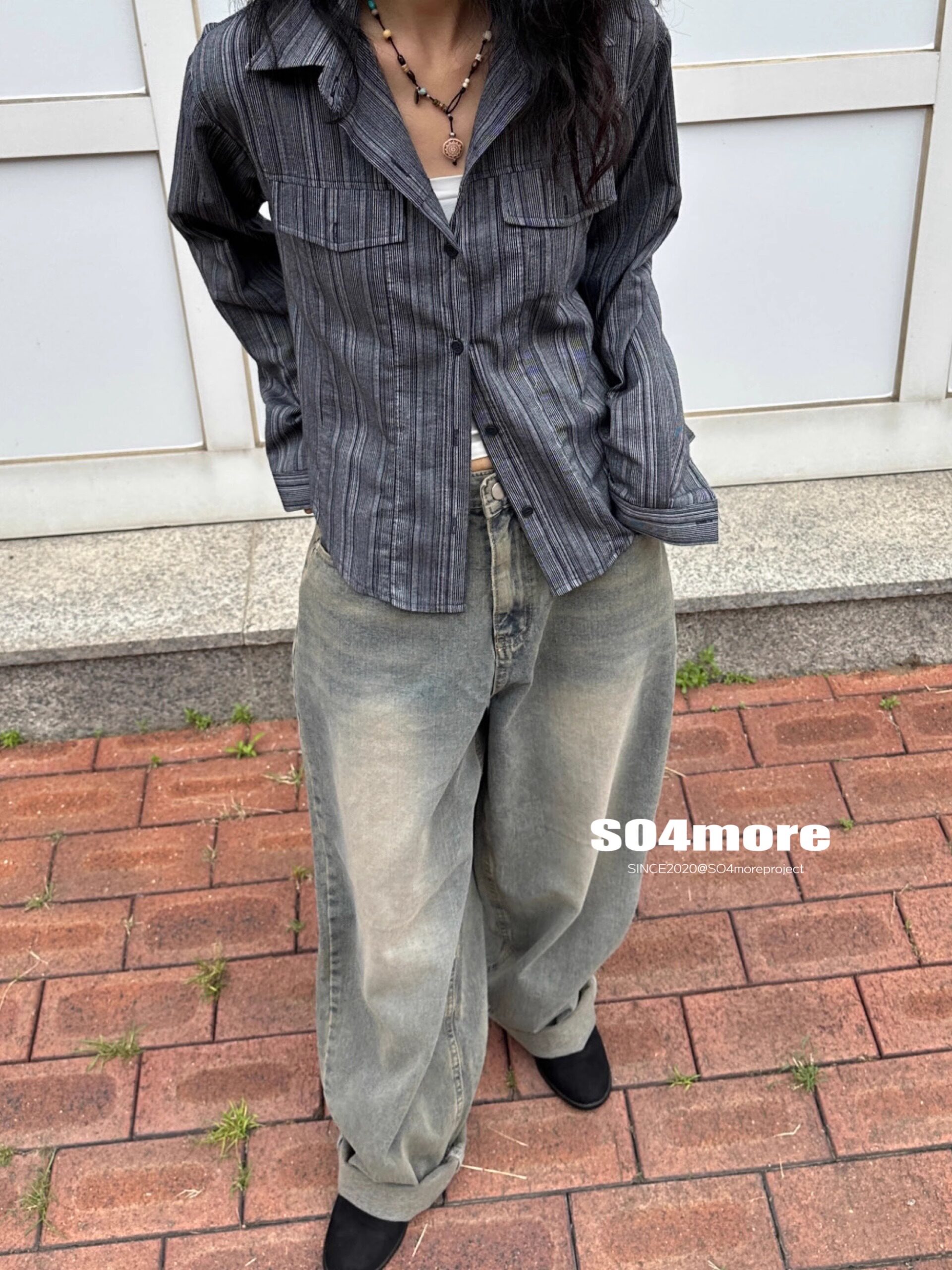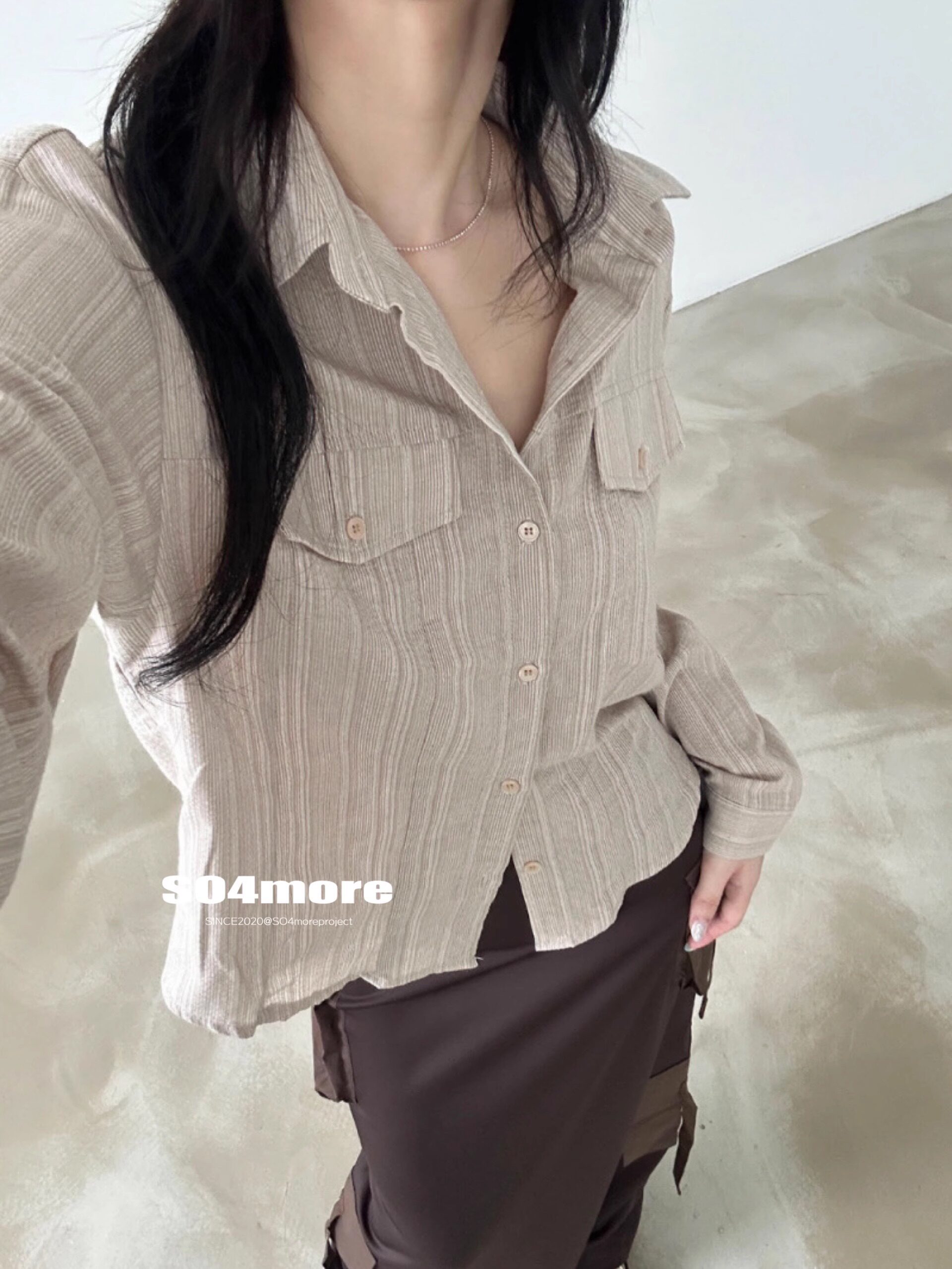 📚 Exclusive type 韩国个性复古暗纹竖条纹口袋单排扣长袖宽松衬衫