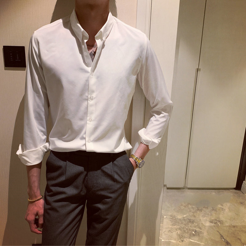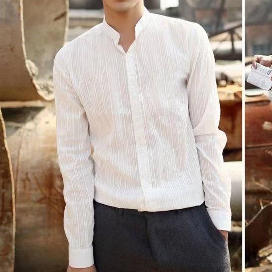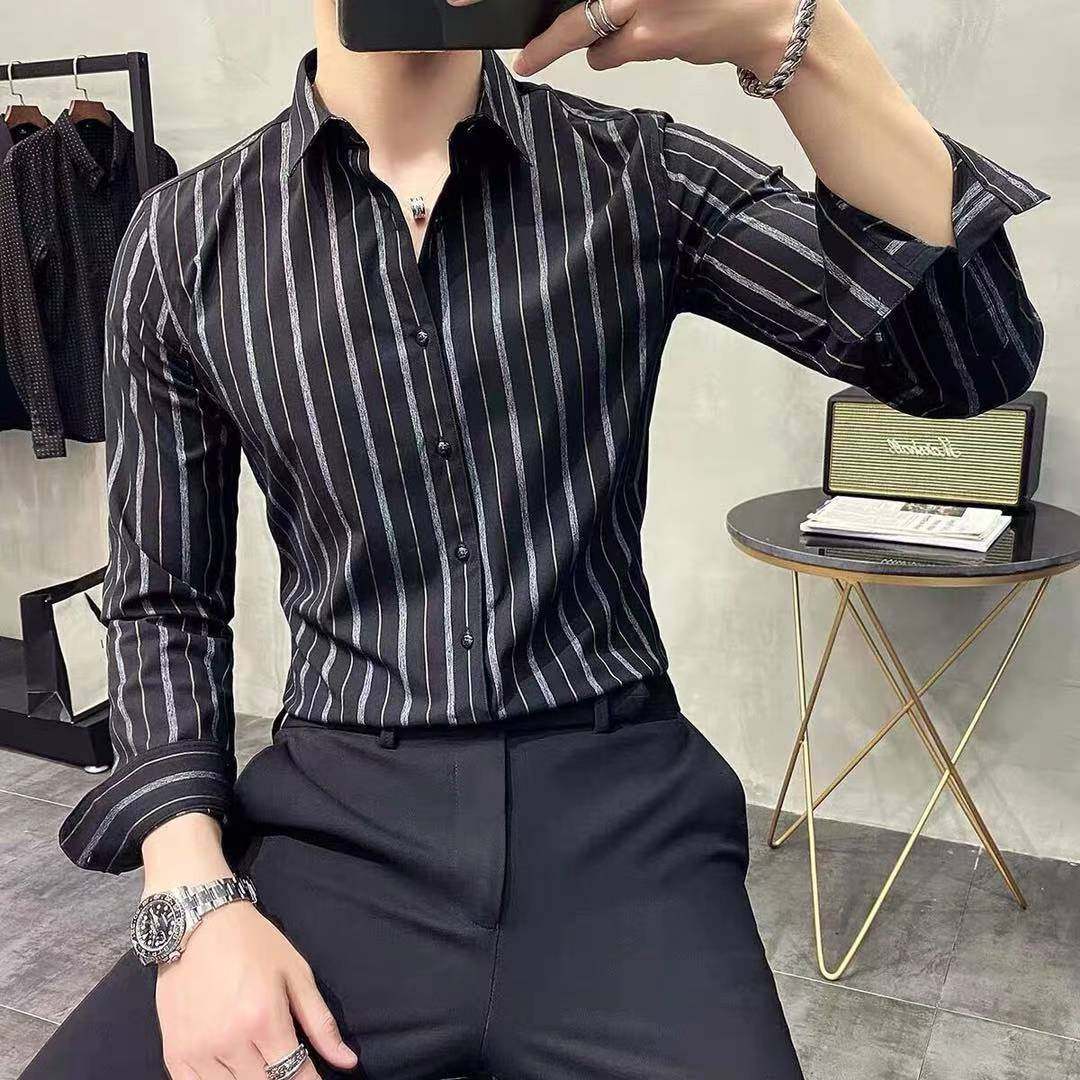 📚 夏季新品韩国韩版一字领免烫长袖衬衫男修身条纹百搭休闲衬衣男士