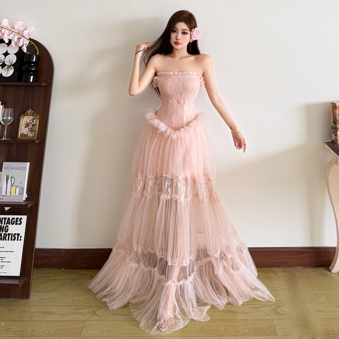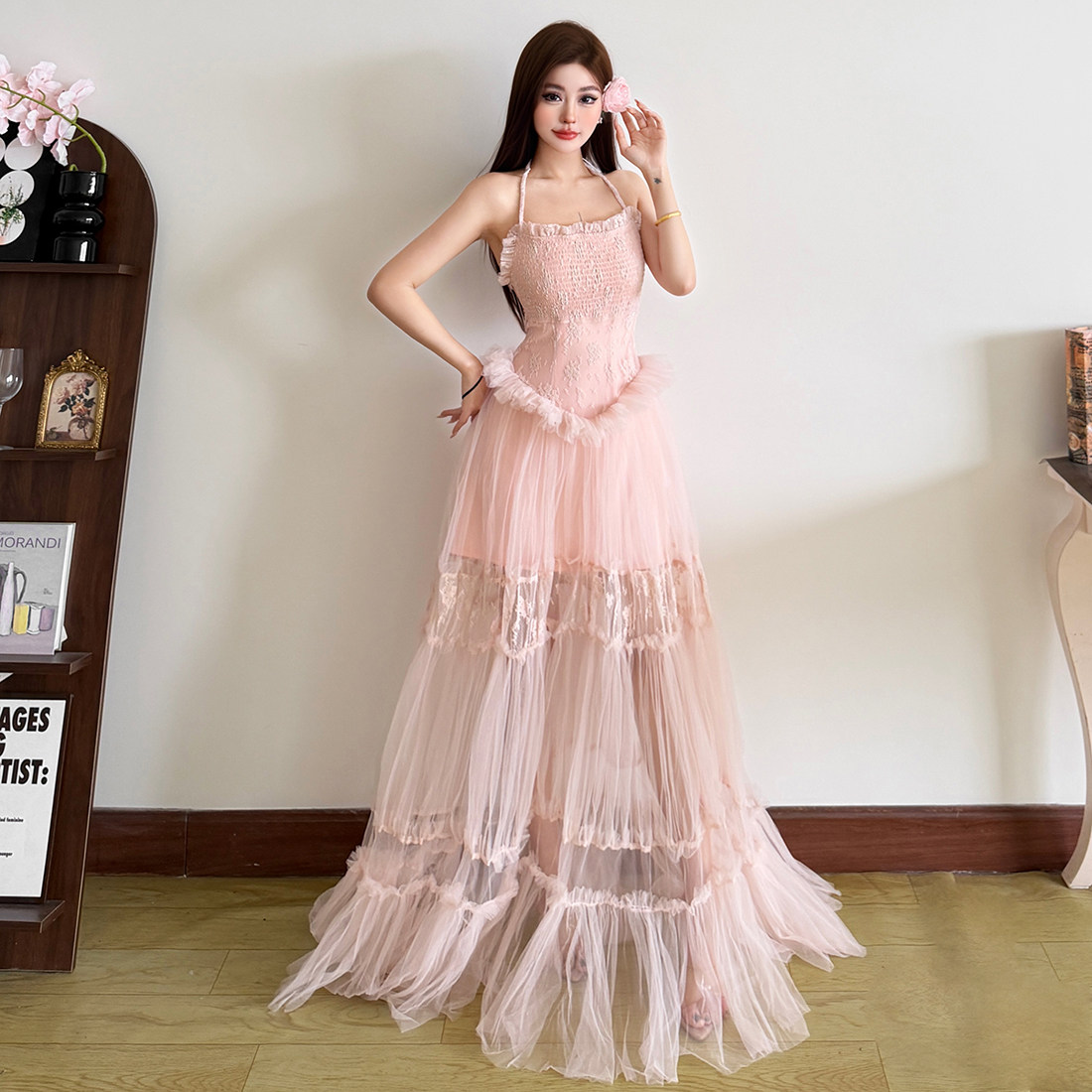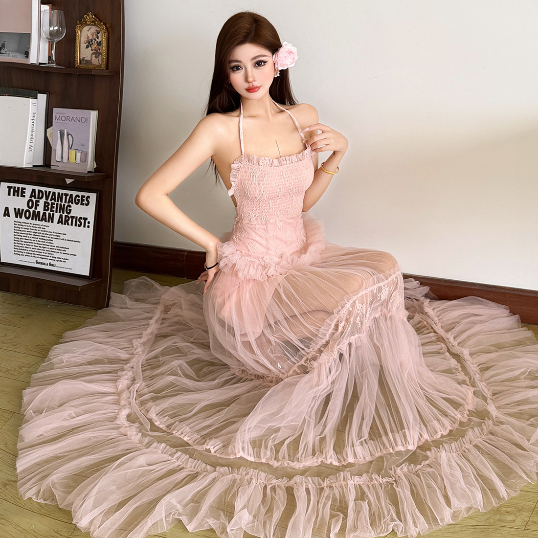 📚 SylCue 如梦如幻花的嫁纱网纱木耳花边挂脖连衣裙飘逸大裙摆长裙