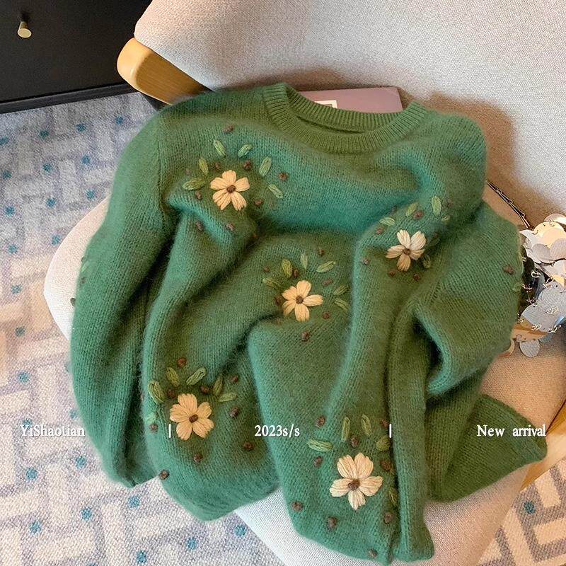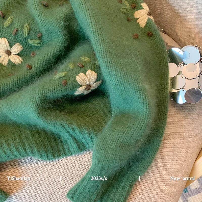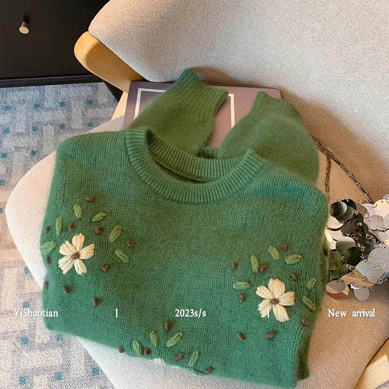 📚 广州十三行女装绿色手工绣花圆领毛衣女秋温柔软糯洋气套头针织衫