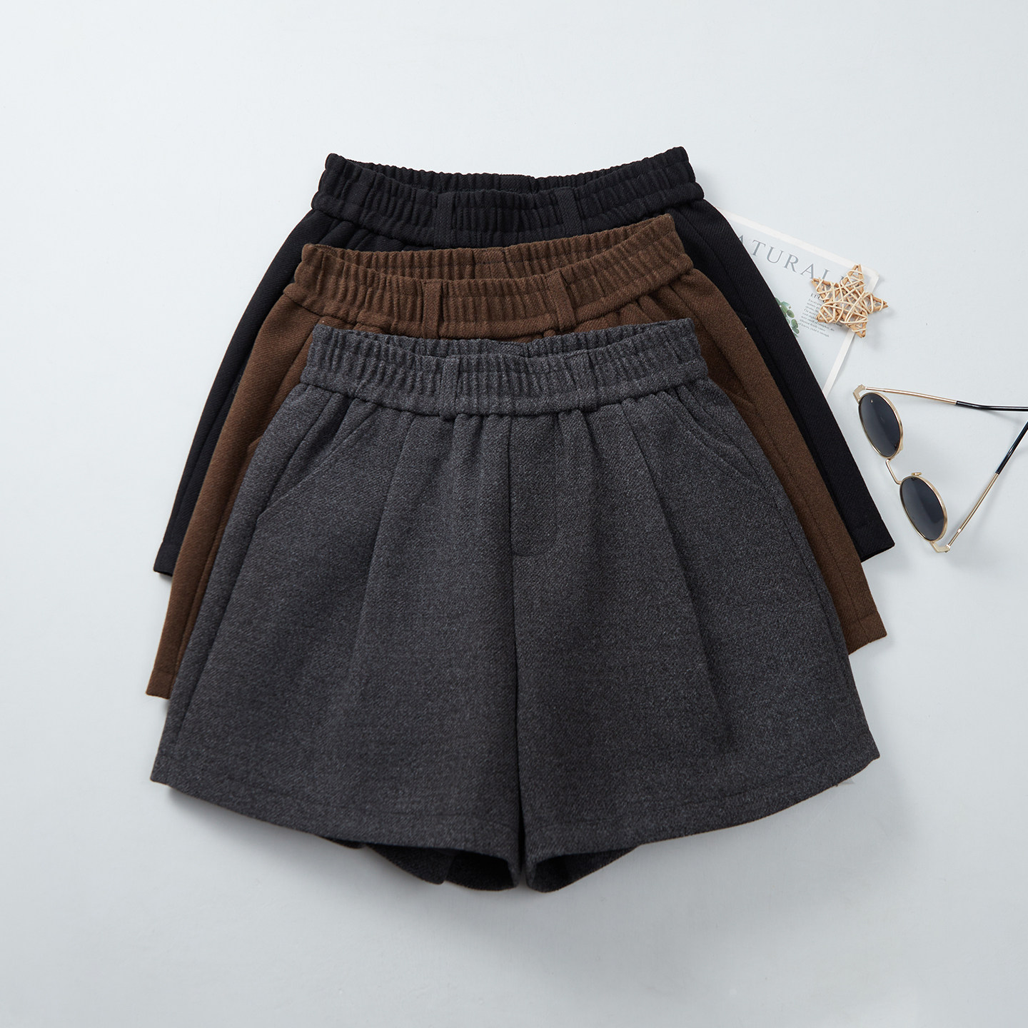 📚 短裤毛呢女外穿冬灰色2025新款松紧高腰显瘦阔腿时尚简约打底靴裤