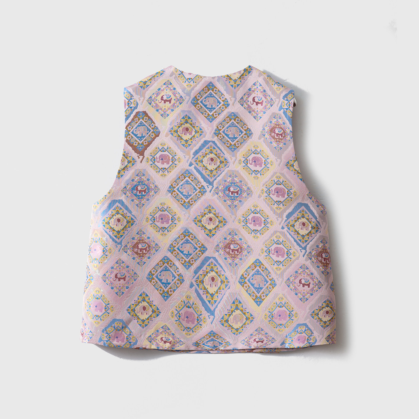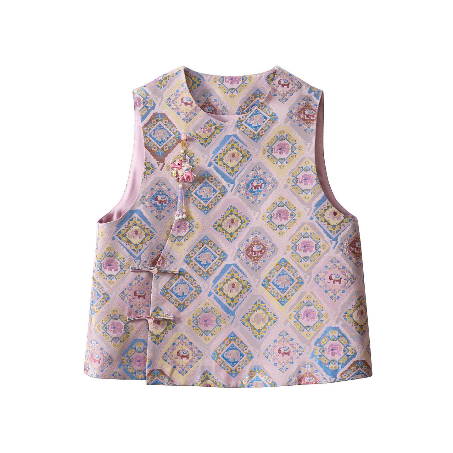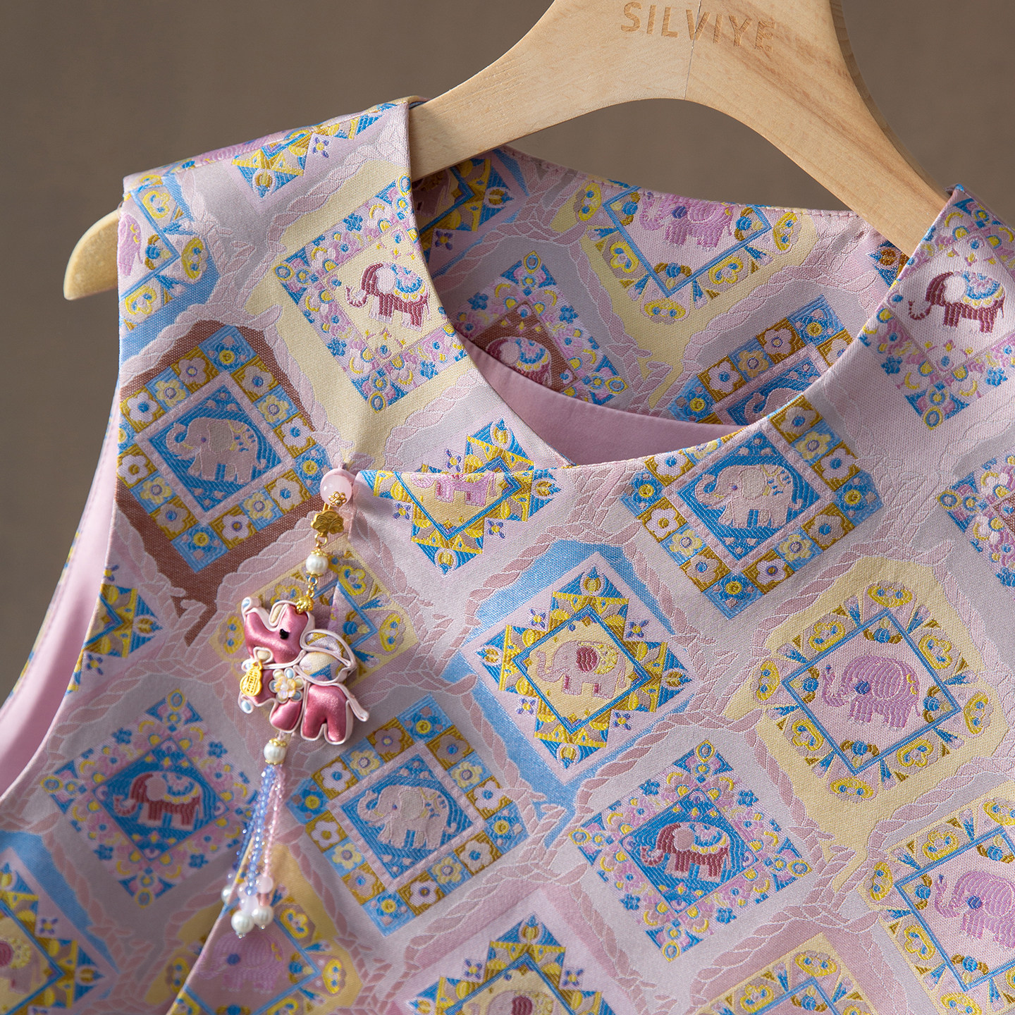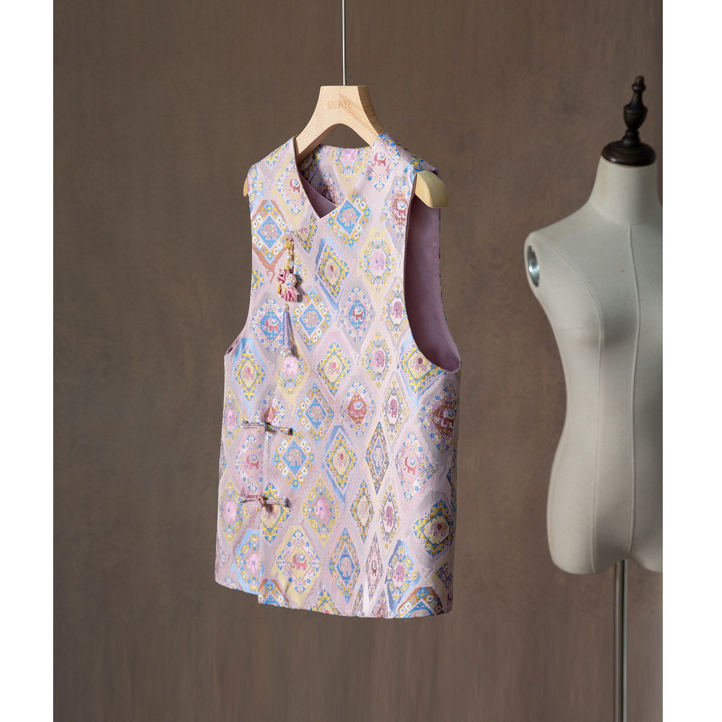 📚 一丝牵 福象福相100%桑蚕丝宋锦提花真丝马甲女斜襟无袖开衫外套