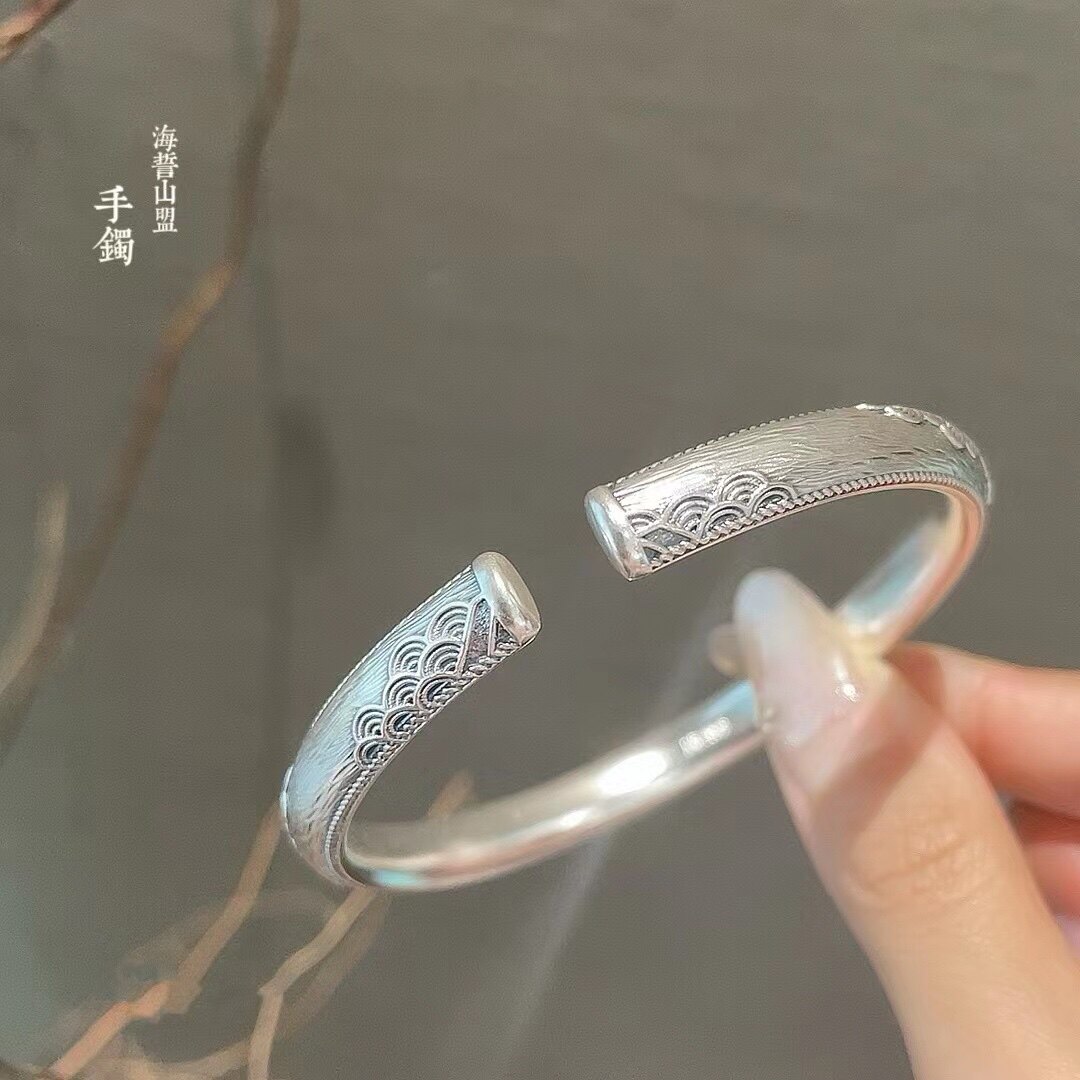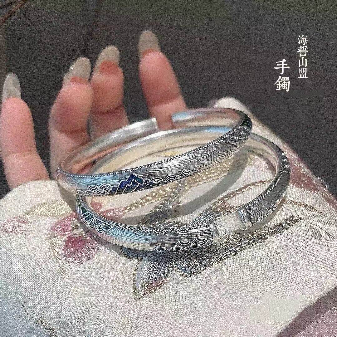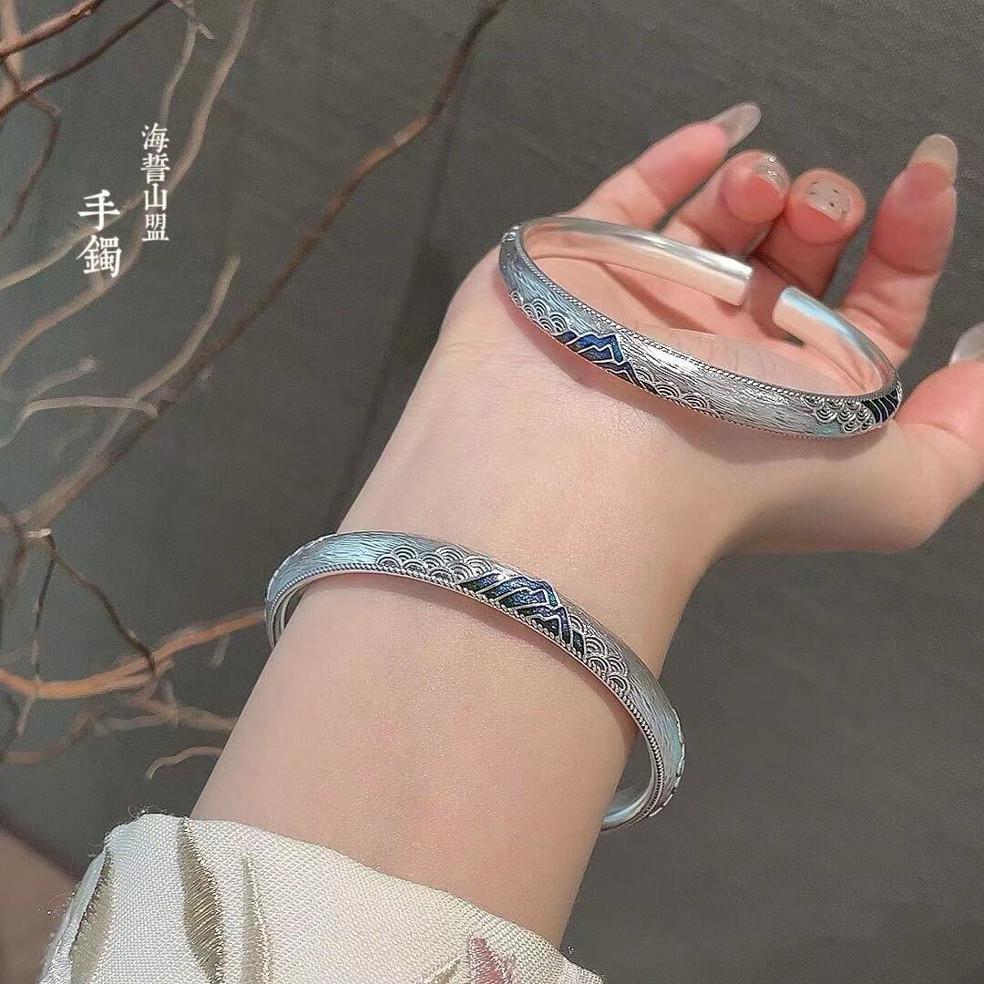 📚 胜银·山盟海誓珐琅经典足银999手镯开口实心内卜情侣纯银手镯