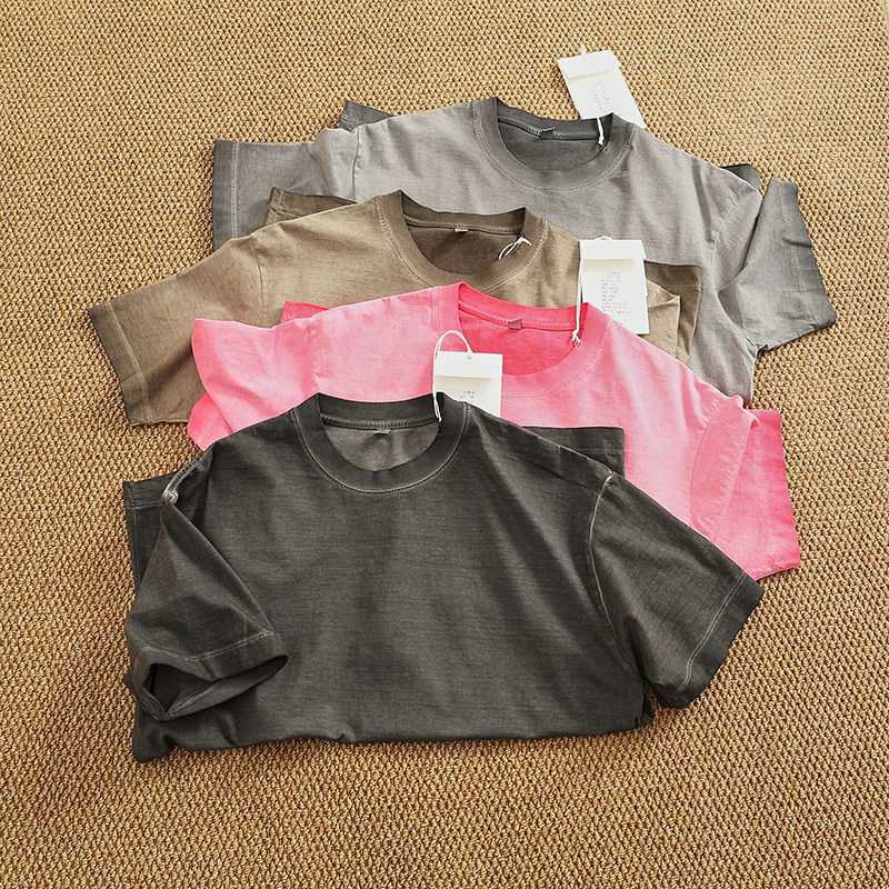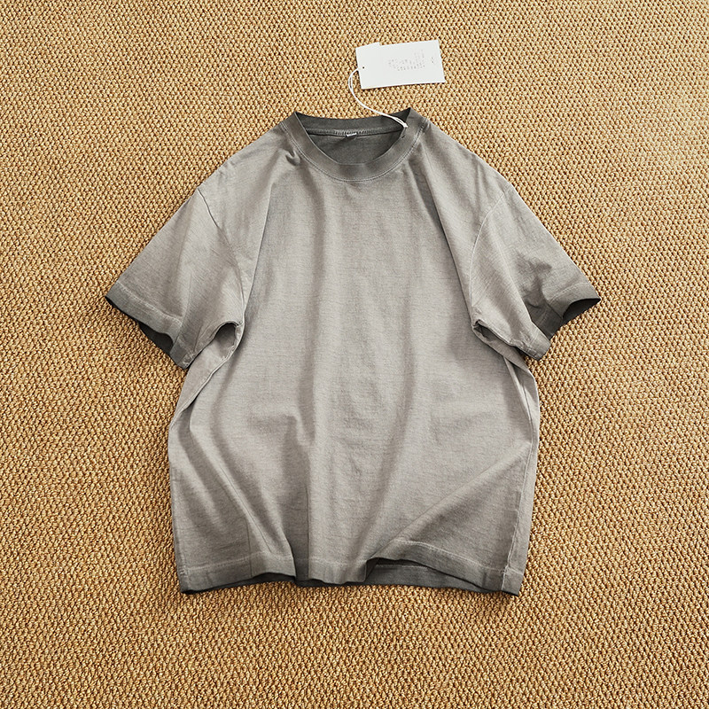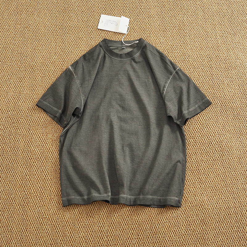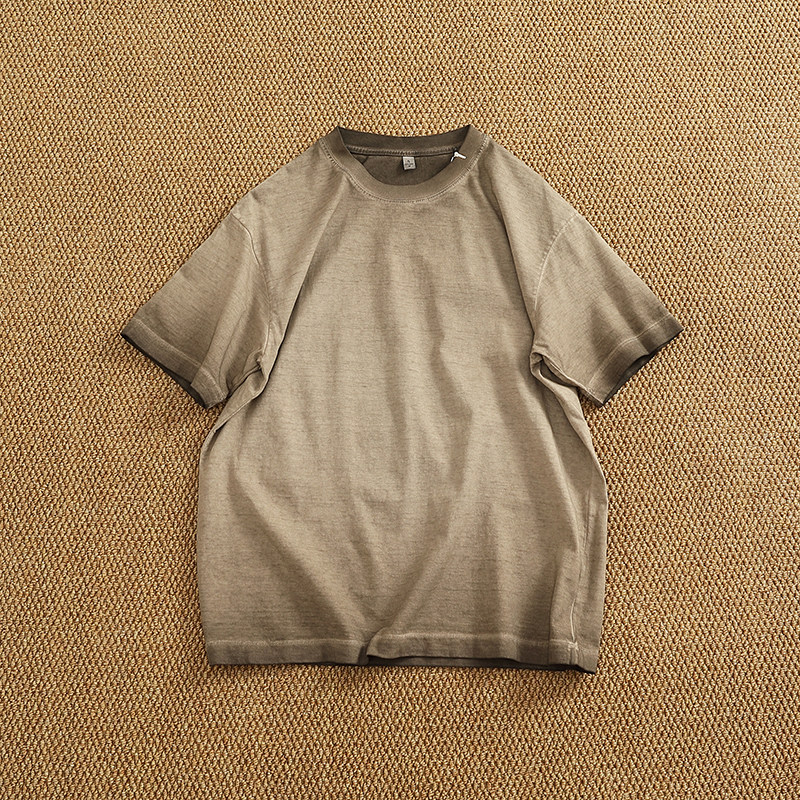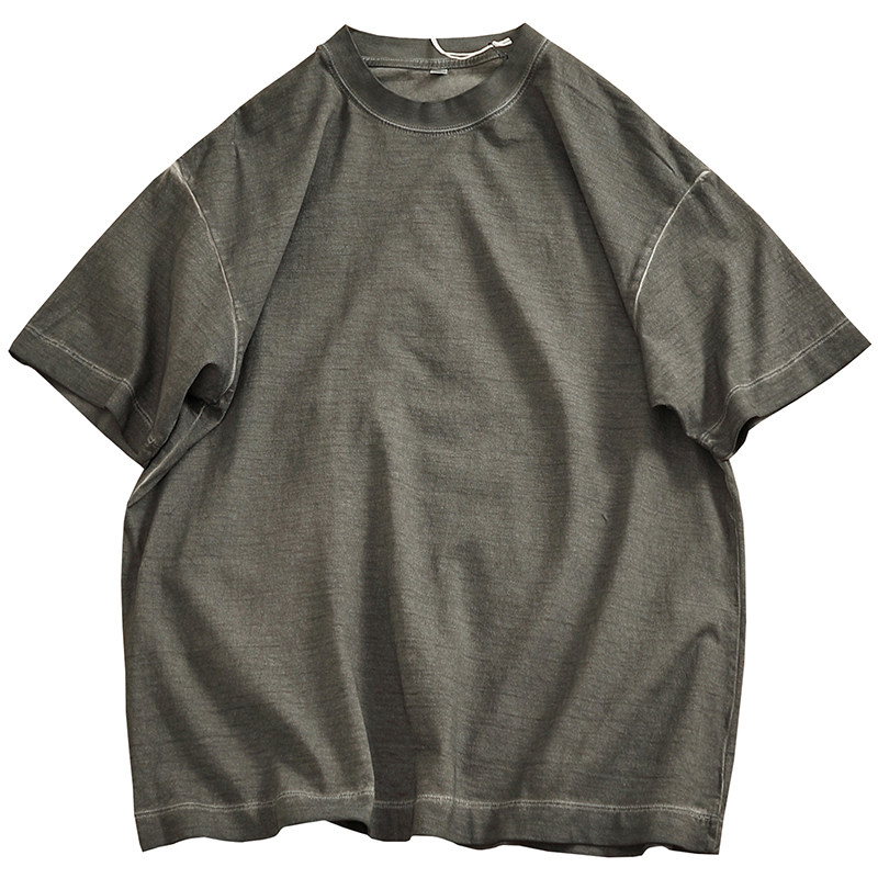 📚 油污脏洗纯棉做旧水洗短袖T恤男潮欧美风圆领宽松落肩袖纯色半袖T