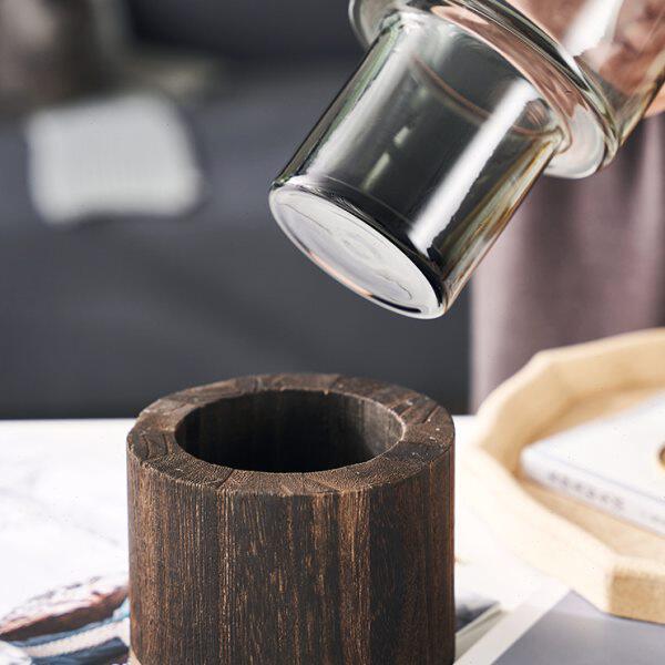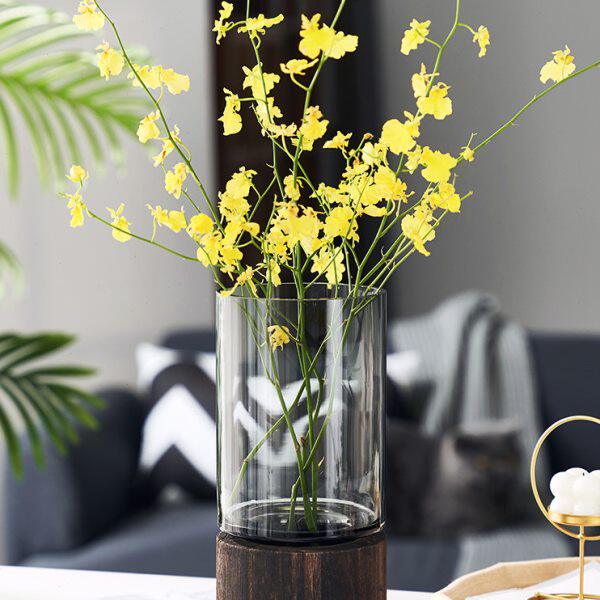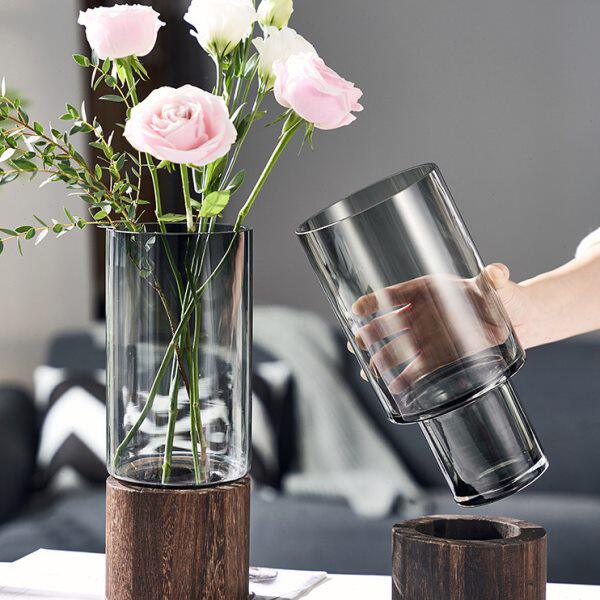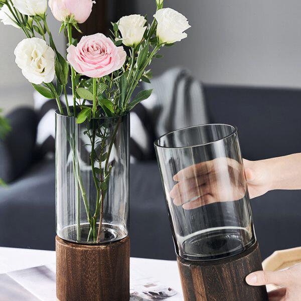 📚 创意简约木托玻璃花瓶直筒原色摆件水养鲜花玫瑰客厅餐桌插花装饰