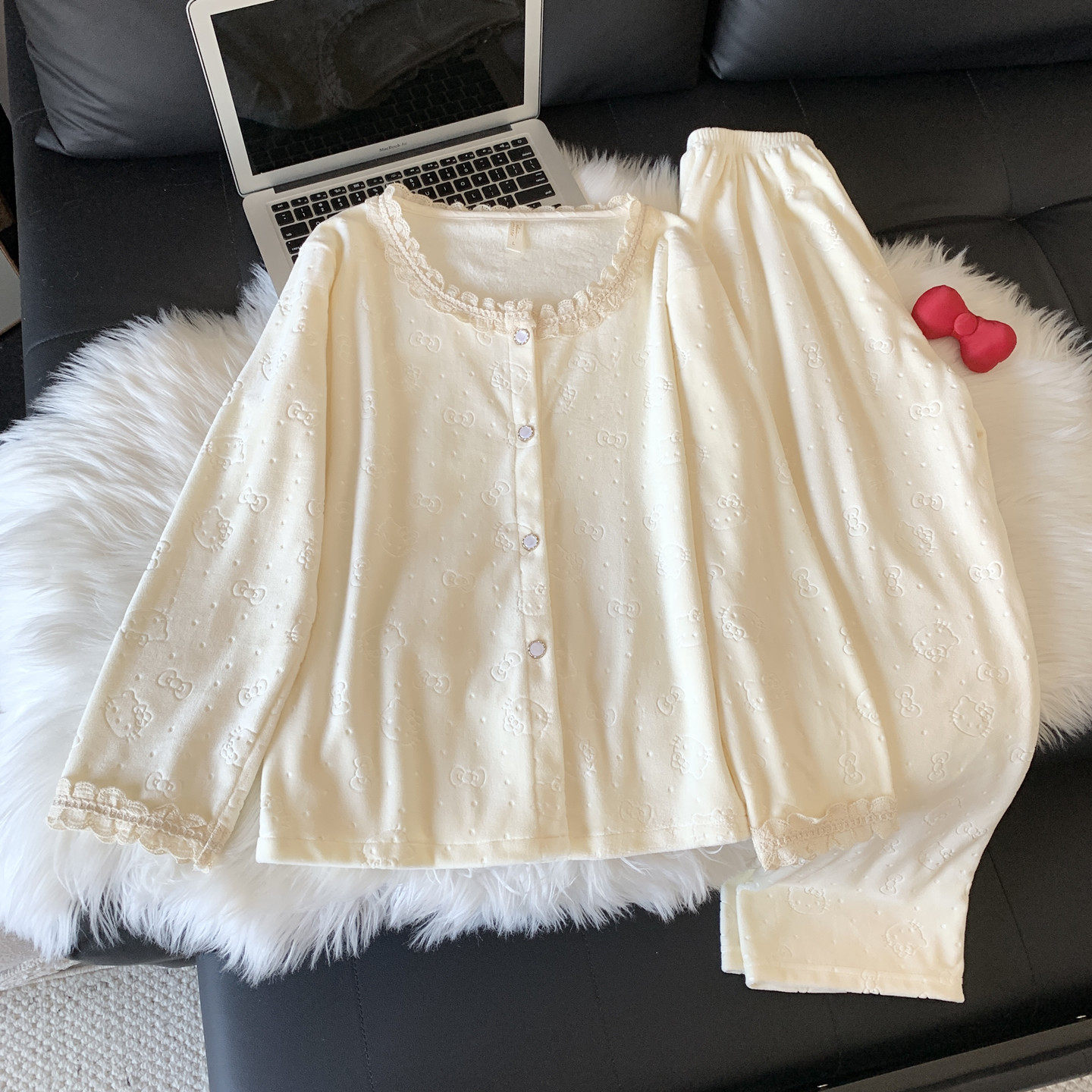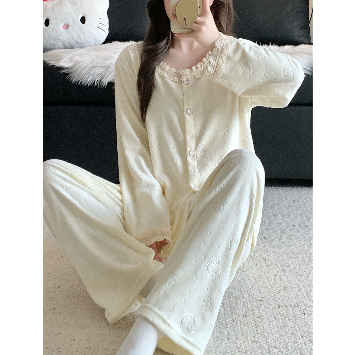 📚 海岛绒睡衣女款秋冬季甜美花边KT猫可外穿加厚保暖长袖套装家居服