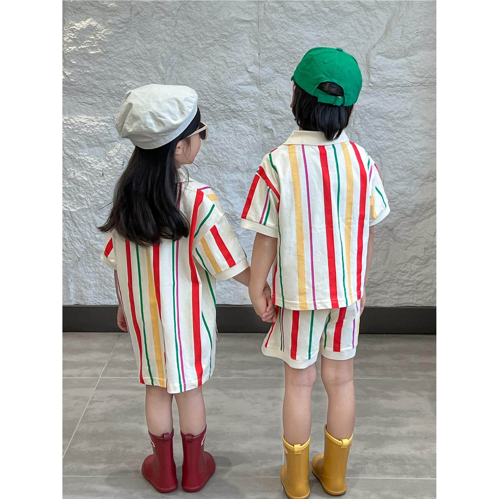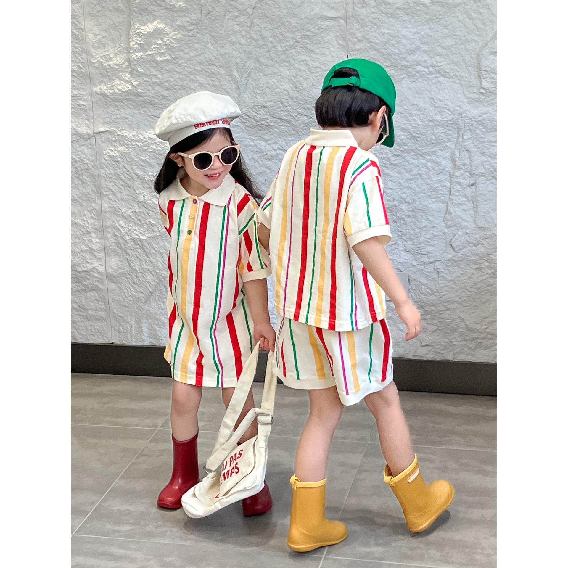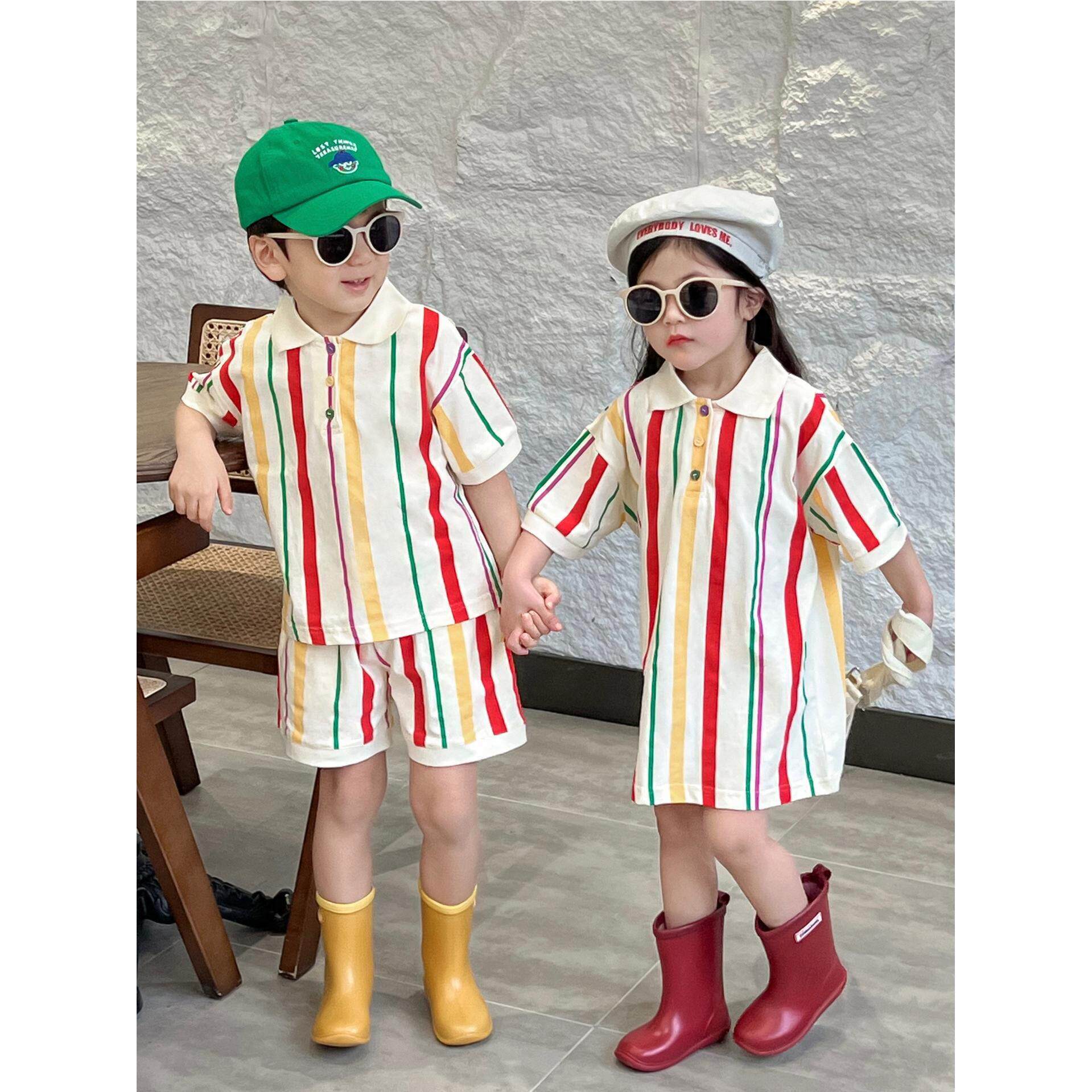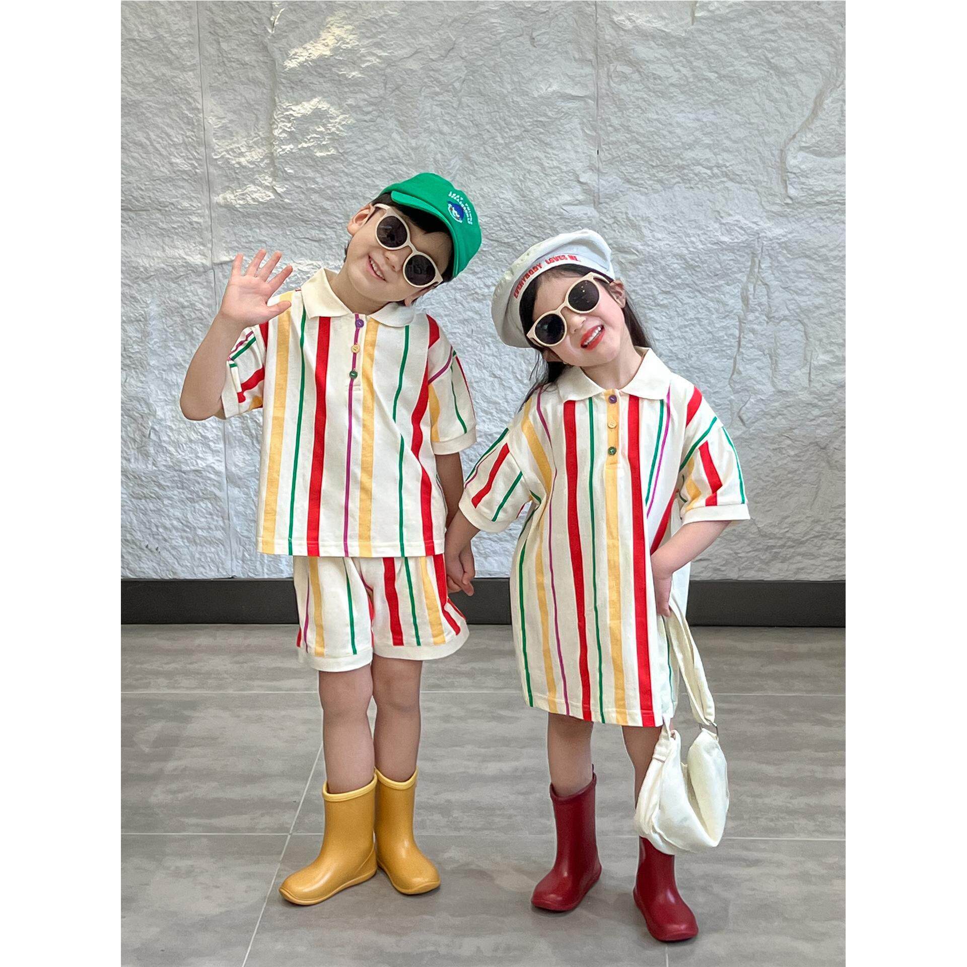 📚 兄妹装龙凤胎儿童夏款韩版男女童姐弟装竖条纹领连衣裙短袖