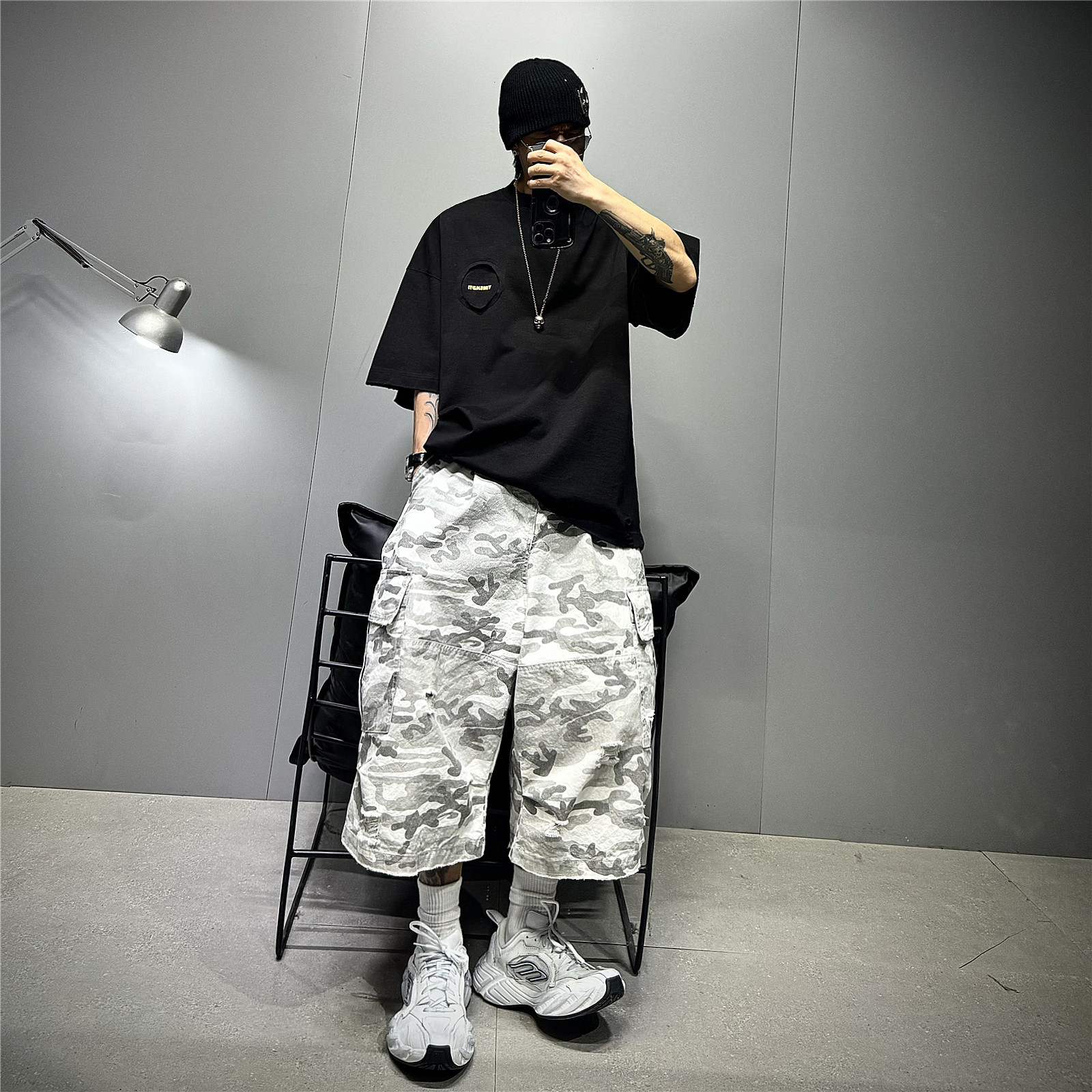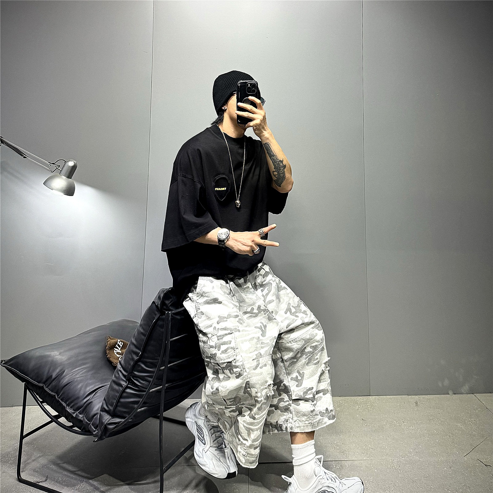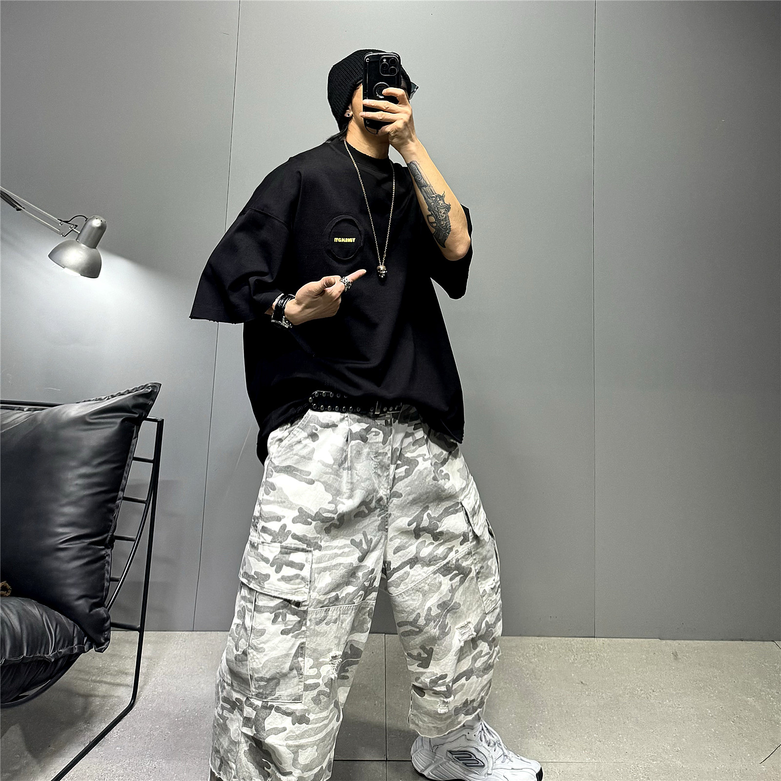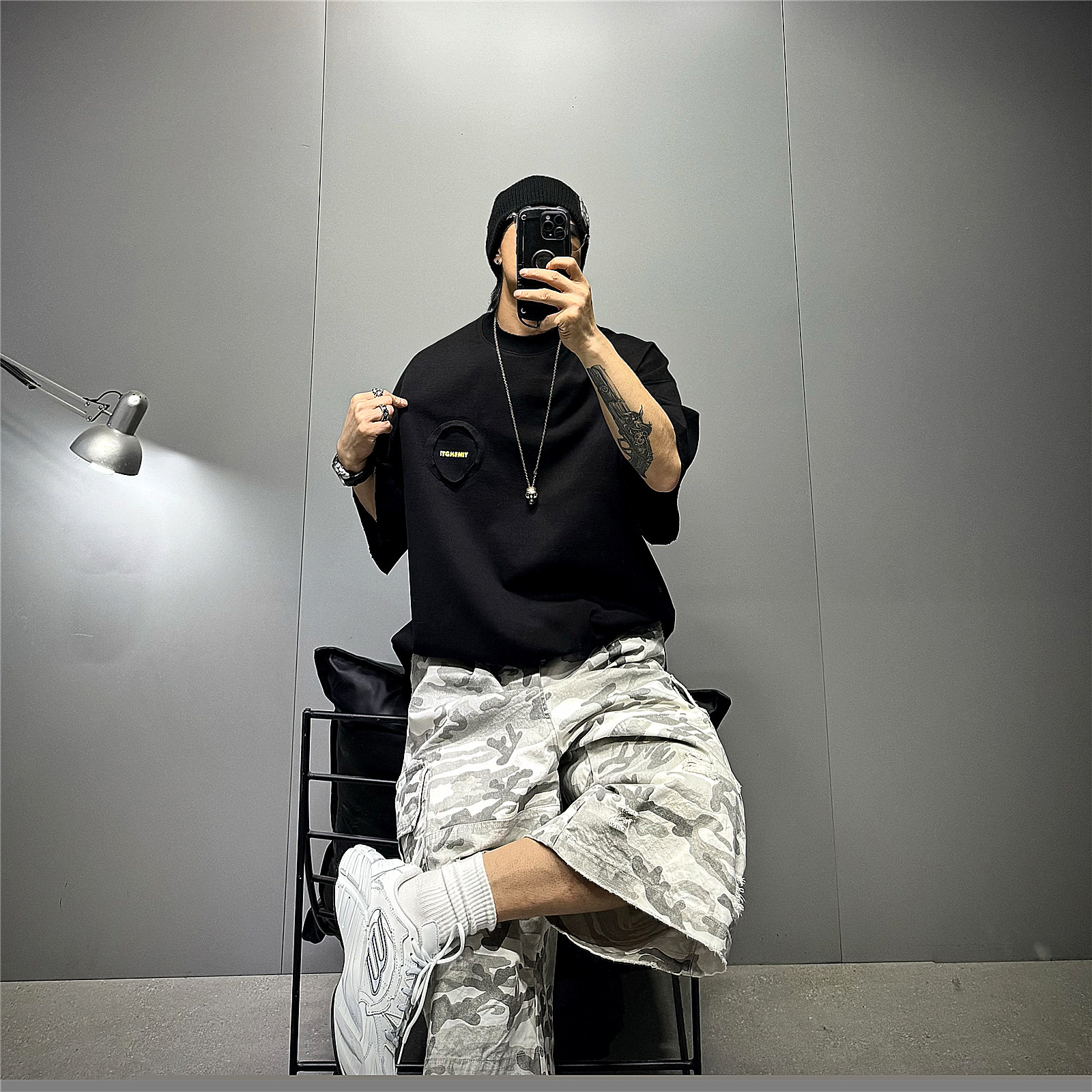 📚 vibe设计小领口破洞短袖t恤男oversize落肩廓形半袖体恤潮牌大版T