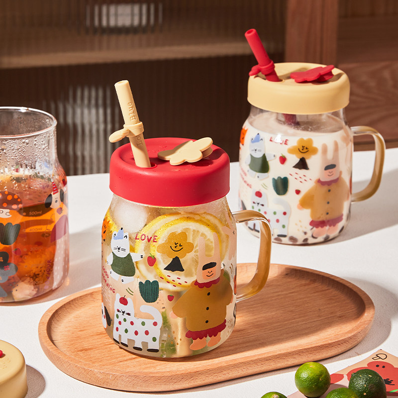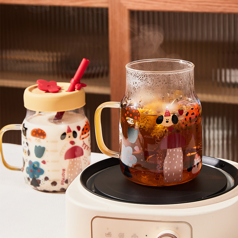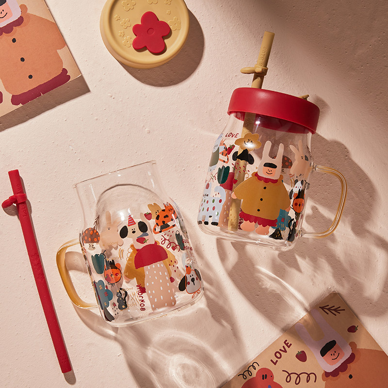 📚 高颜值女孩爱画鸭耐高温大容量吸管玻璃水杯饮料杯奶茶牛奶杯子女