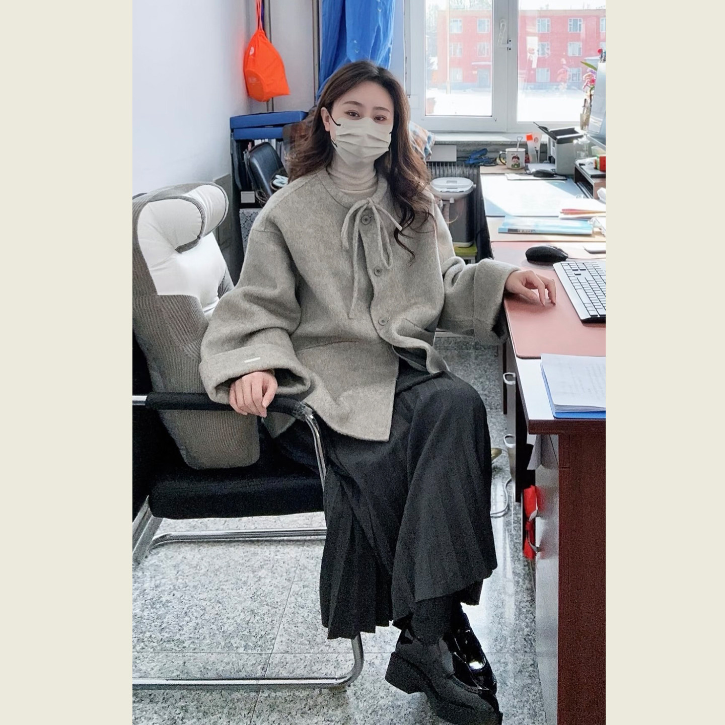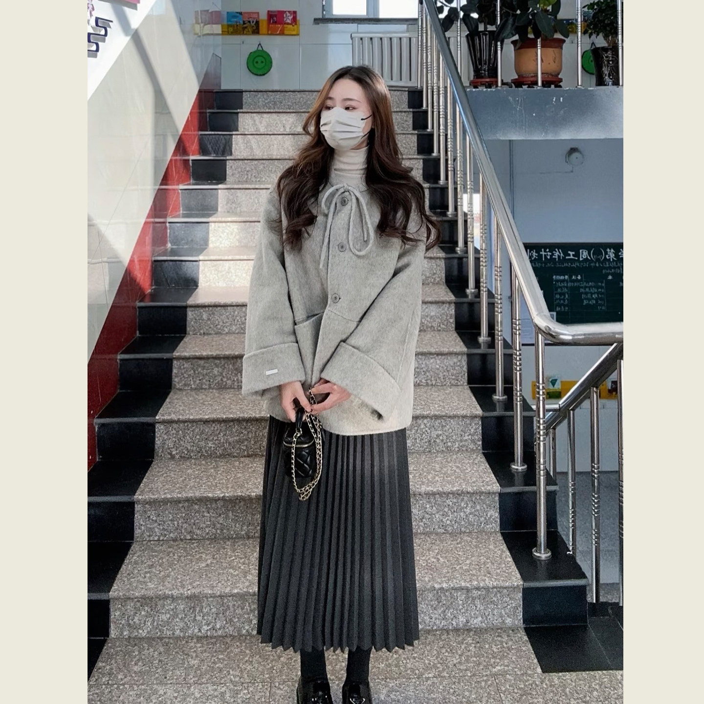 📚 韩系赫本风灰色减龄短款呢子大衣女秋冬小个子单排扣圆领毛呢外套