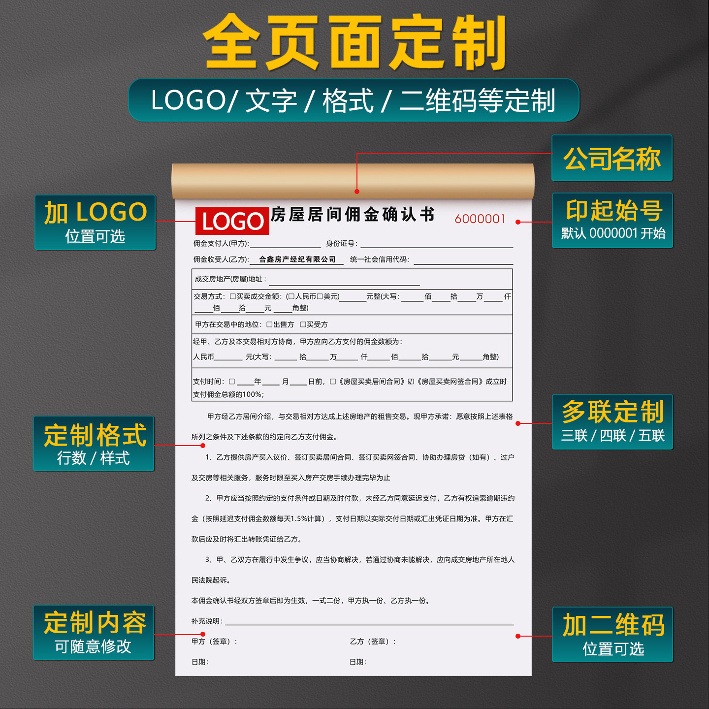 📚 【佣金确认书】房产中介服务单据房屋租赁买卖居间合同二手房出售委托协议看房意向金房源信息登记本定金收据