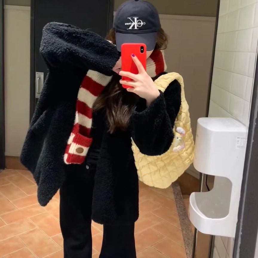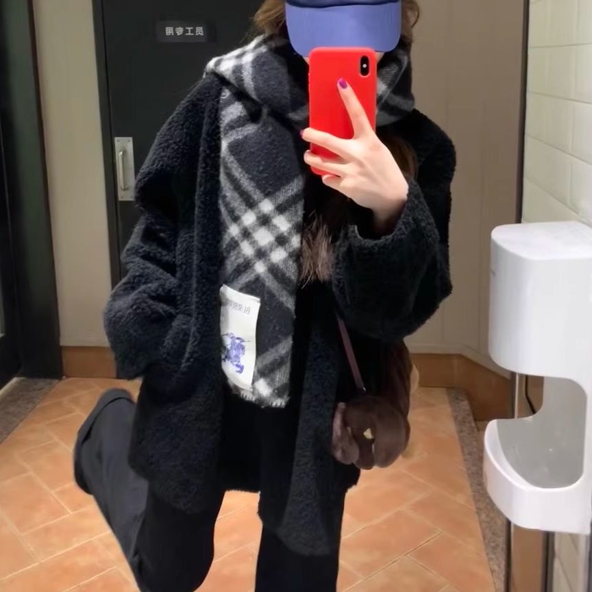 📚 环保皮草女款2025秋冬新款黑色羊羔毛皮毛一体外套中长款毛毛大衣