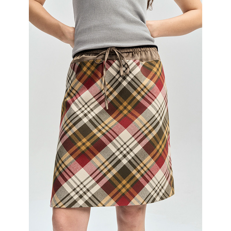 📚 LEONSENSE力上司 英伦格纹A字半裙 橄榄绿色拼接撞色复古休闲女装