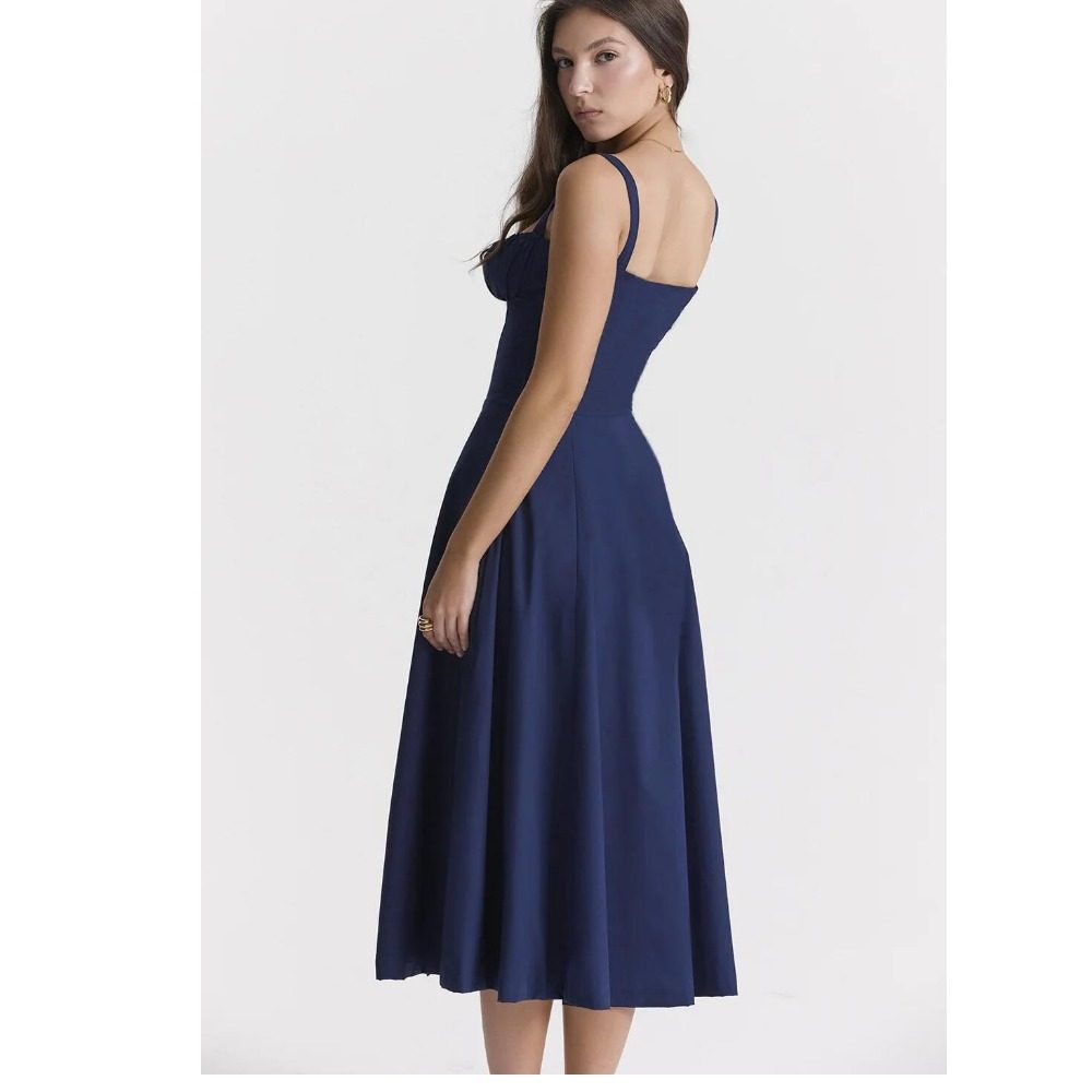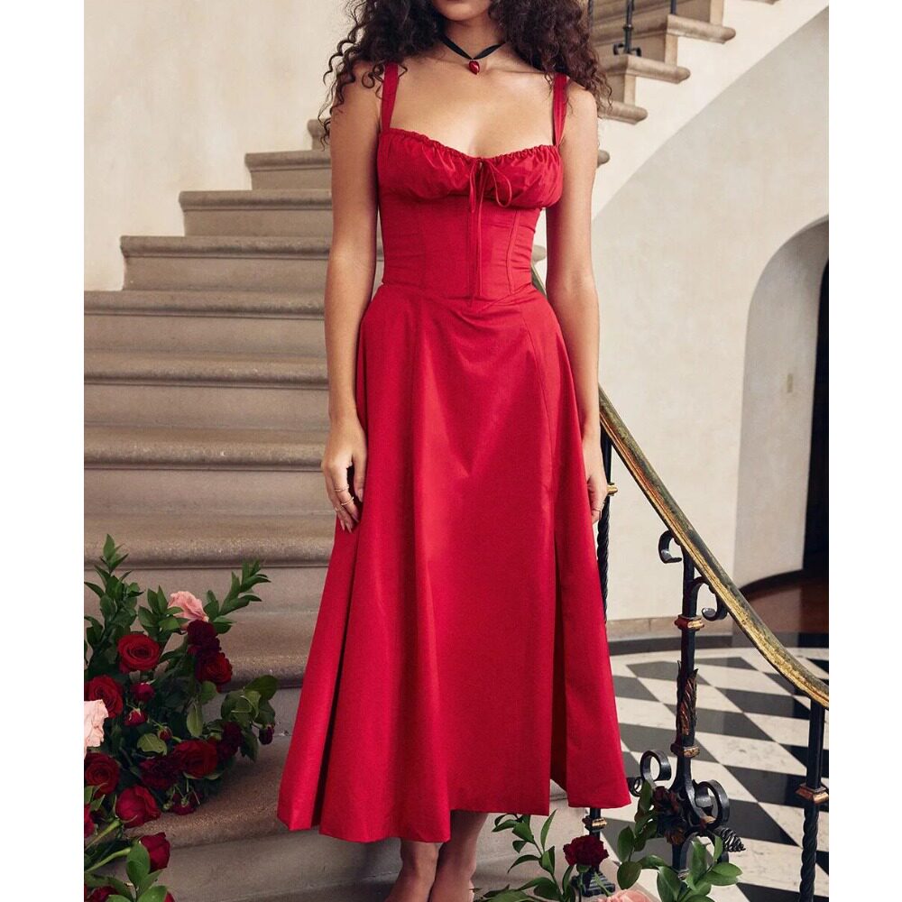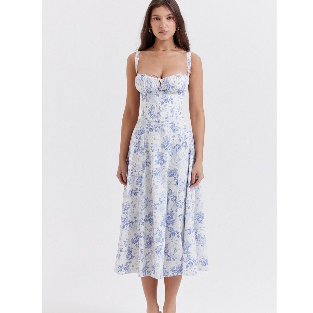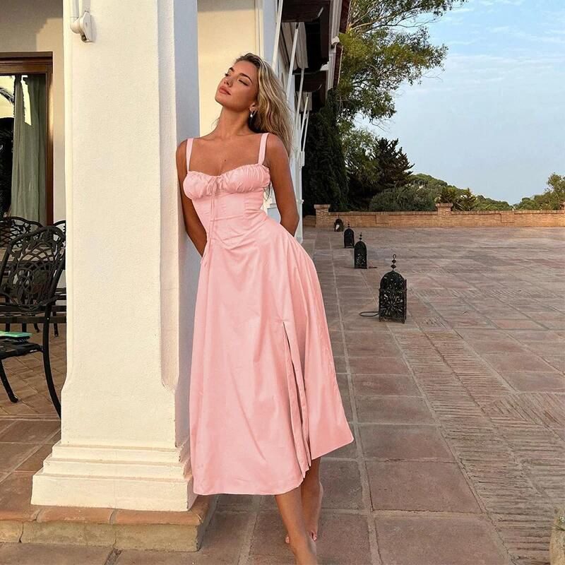 📚 甜美夏季欧美一字领系带碎花收腰开叉中长款吊带连衣裙礼服裙