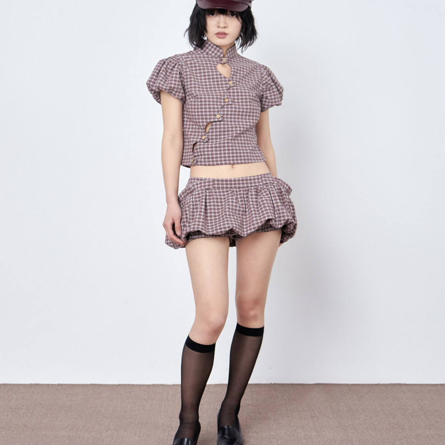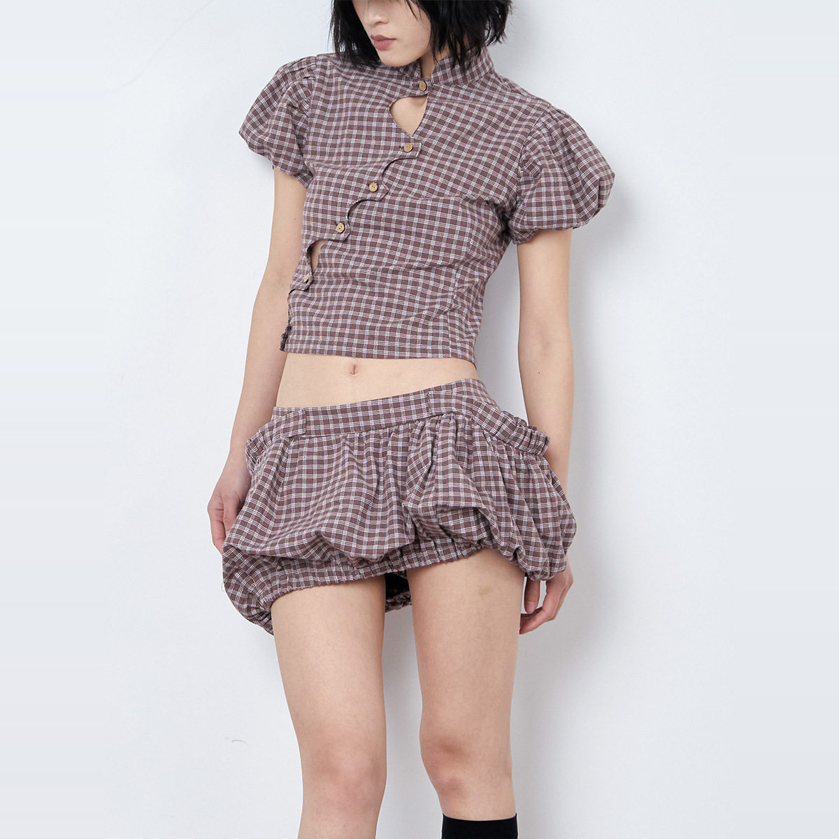 📚 TROPICEYE 25原创新中式立领格纹泡泡衬衫短款短袖修身显瘦上衣