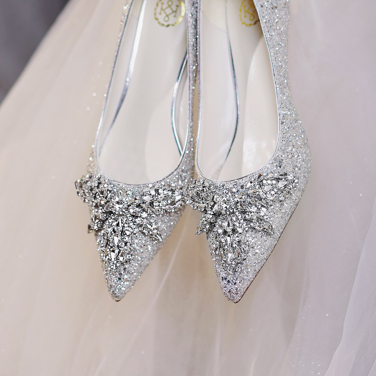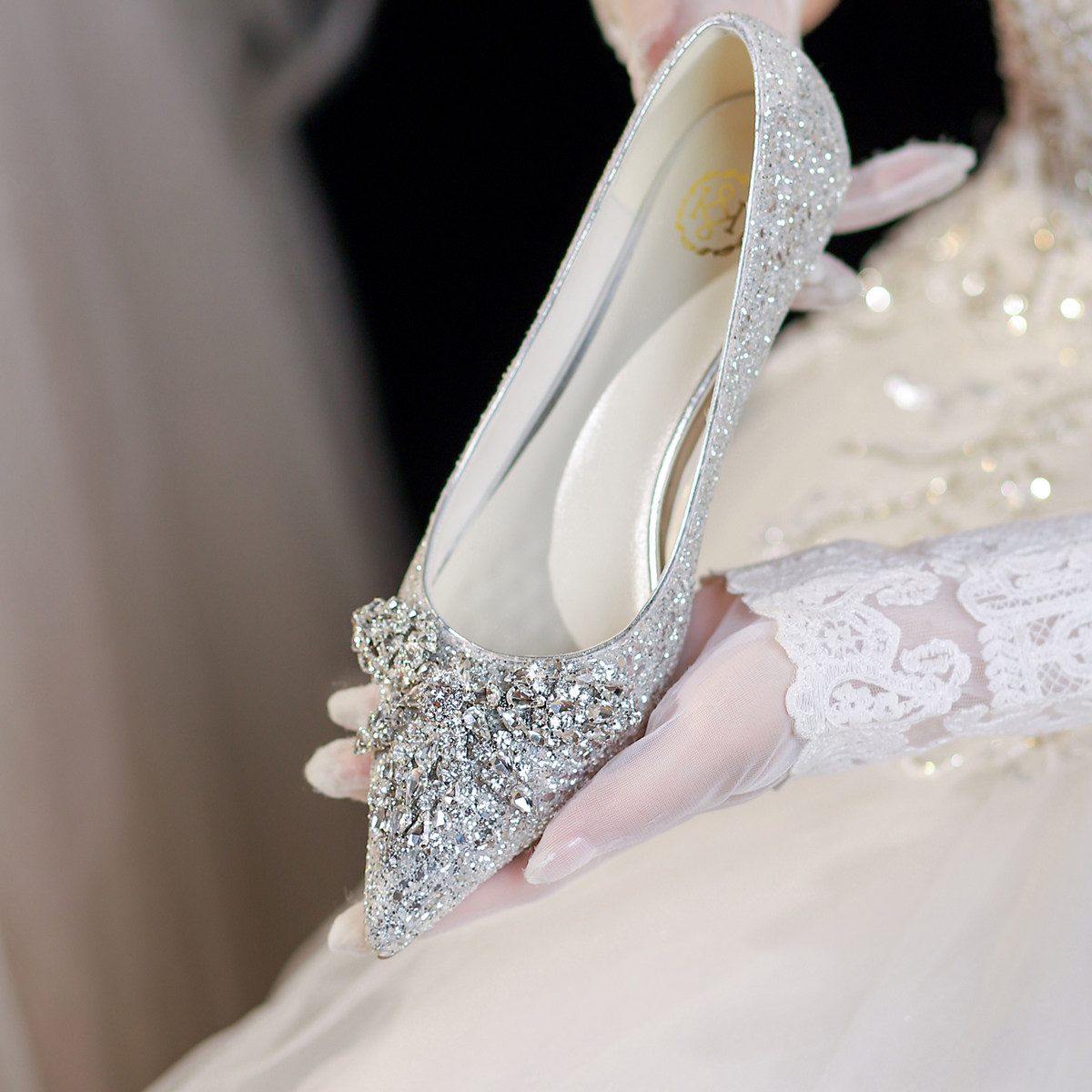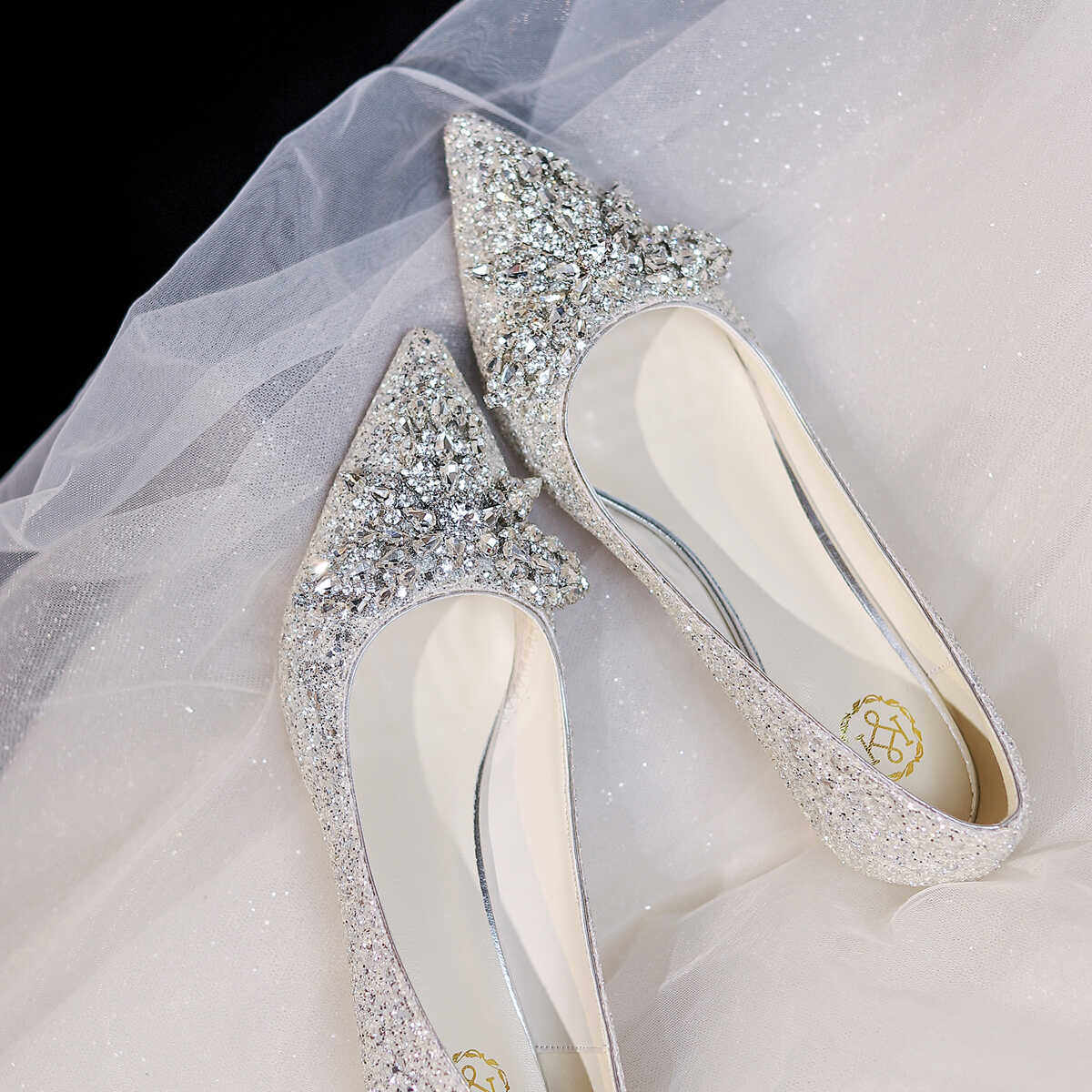 📚 低跟法式银色平底婚鞋新娘鞋水晶鞋女主婚纱亮片订婚结不累脚伴娘