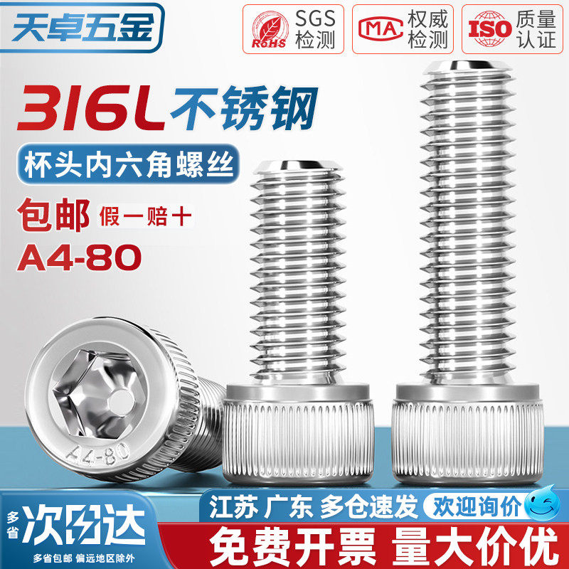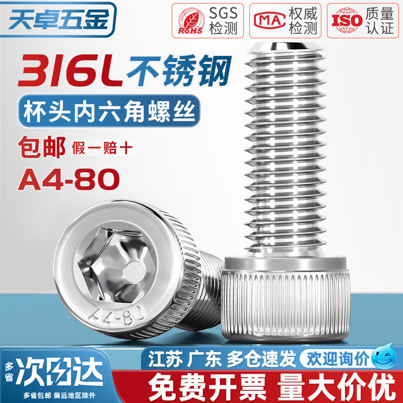 📚 A4-80 杯头螺丝316L不锈钢内六角DIN912圆柱头螺栓M4M5M6M8M10M12