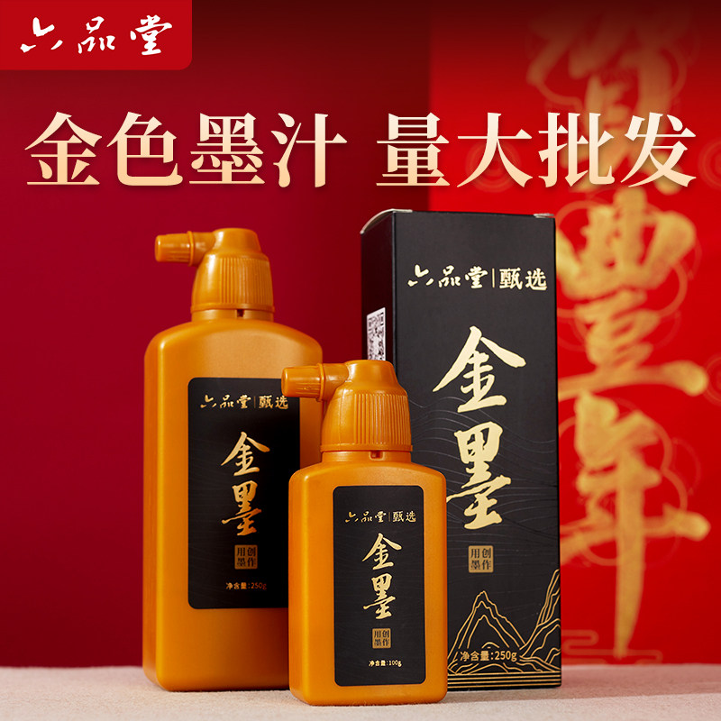 📚 六品堂金色墨汁毛笔墨水学生用写对联纸书法专用快干朱砂墨墨液国画大容量瓶装书画写春联练习金粉250g金墨