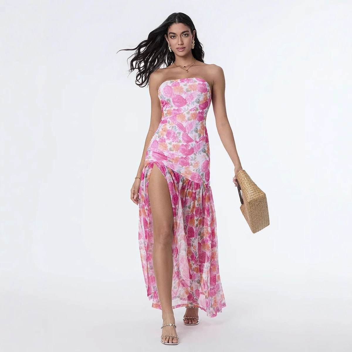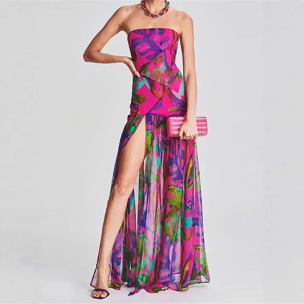 📚 夏季欧美风印花抹胸开叉连衣裙女Elegant Print Slit Long Dress