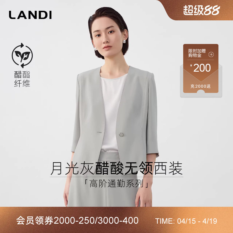📚 [高阶通勤]LANDI蓝地月光灰醋酸无领七分袖西装套裙套装春夏新品