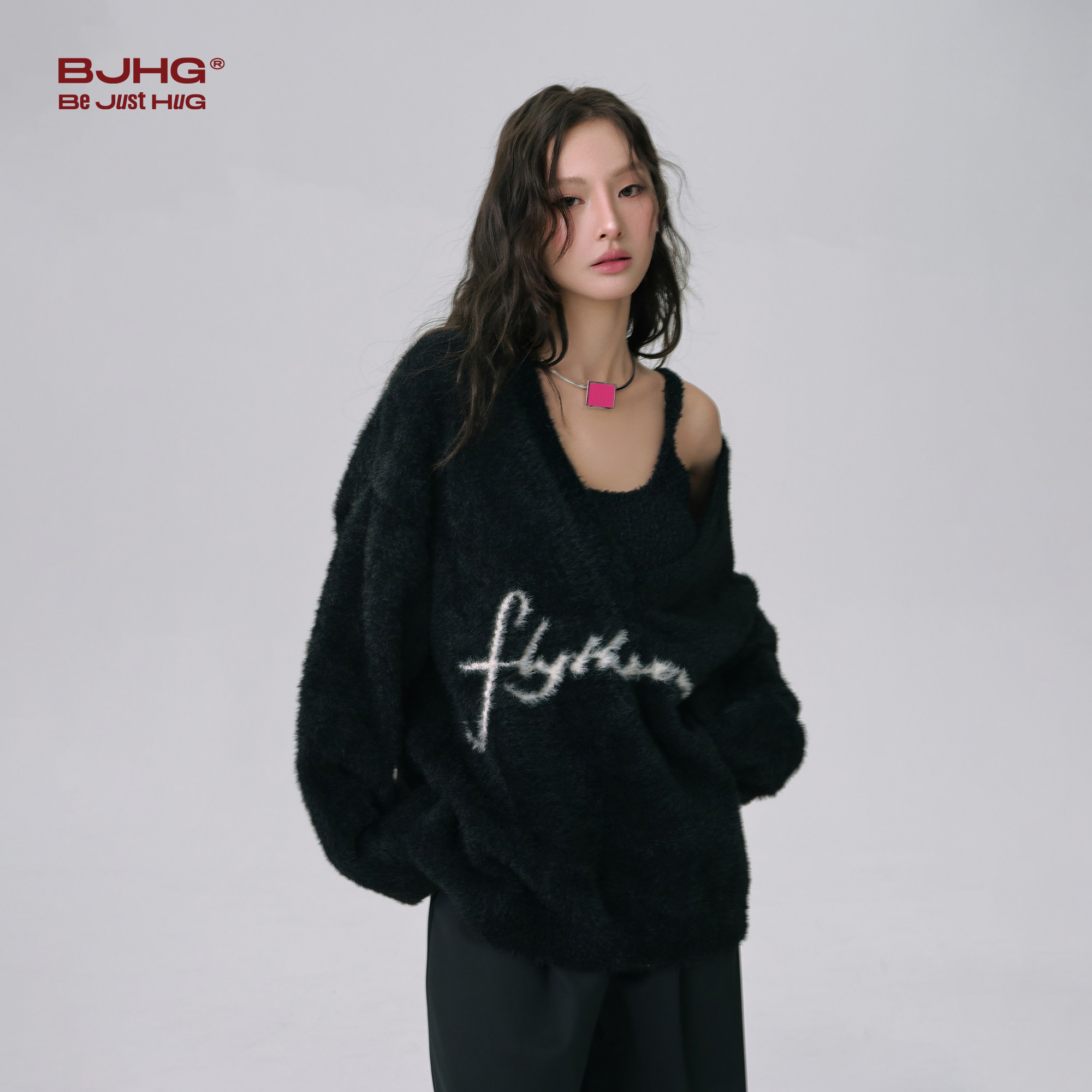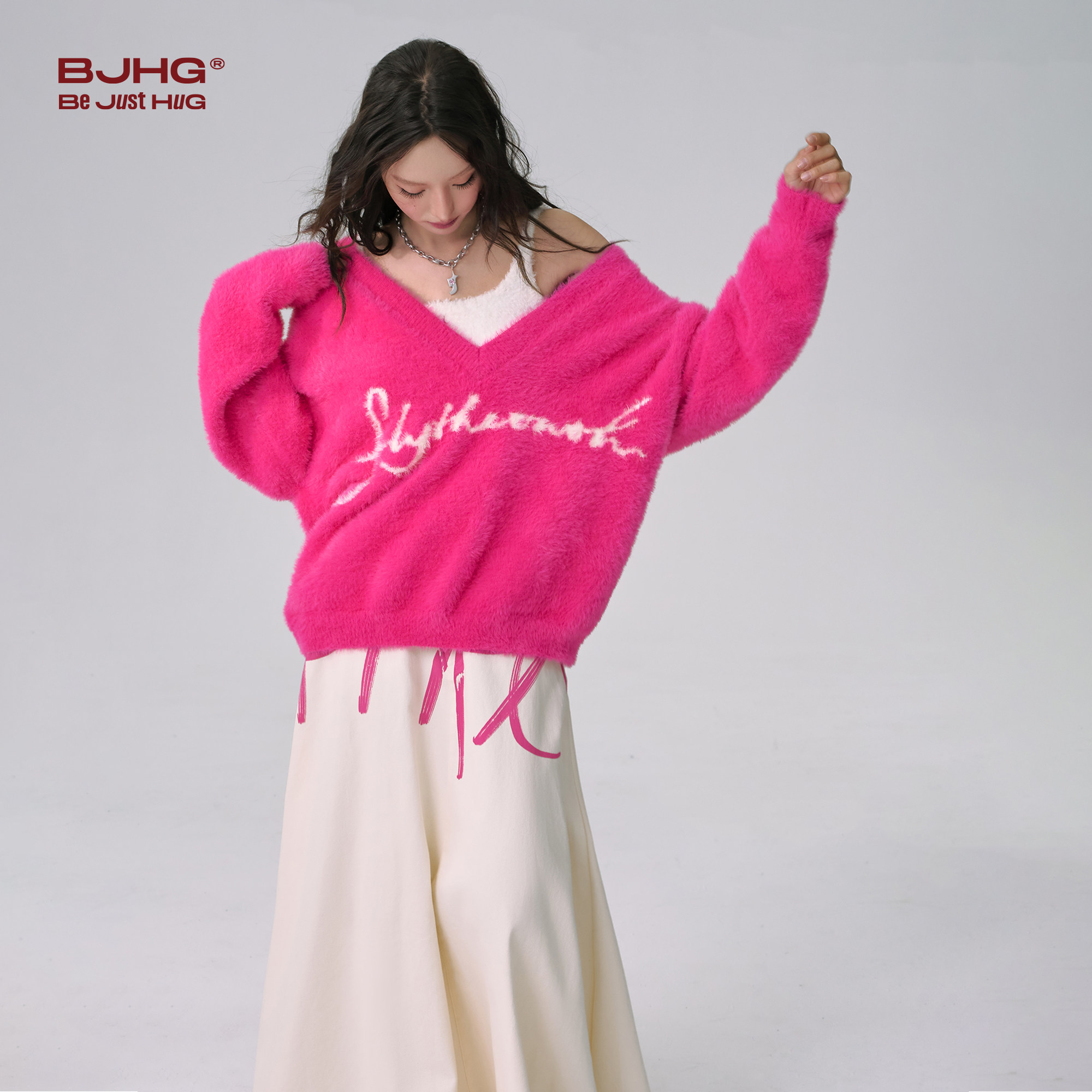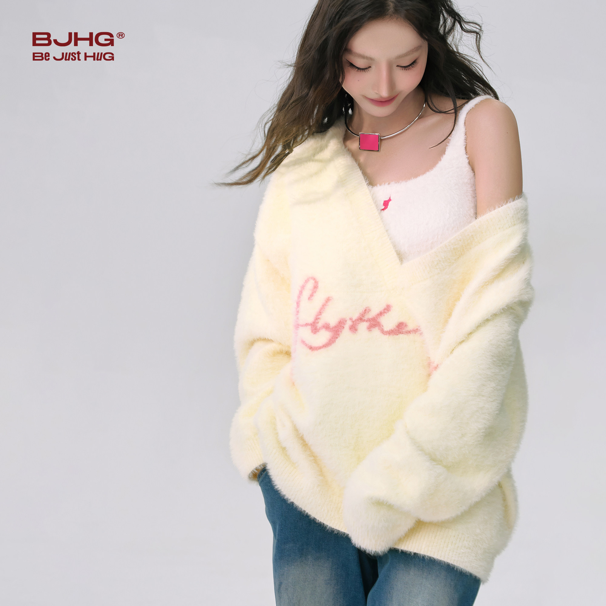 📚 FTT Flythetruth粉红天鹅颈毛衣女冬新款慵懒感V领针织衫上衣外套