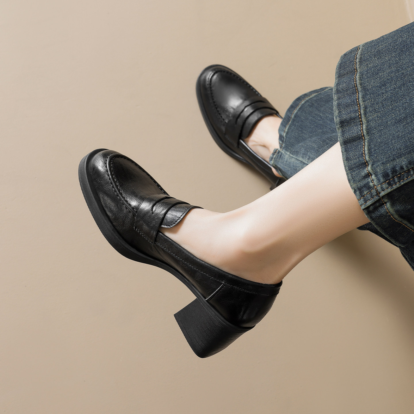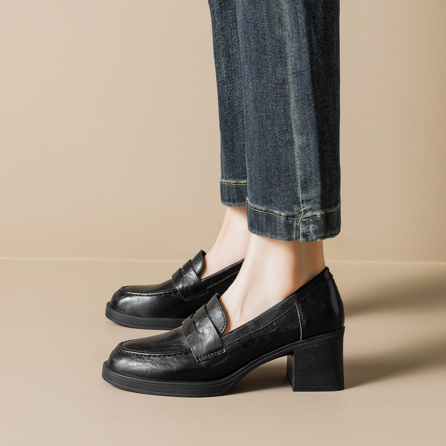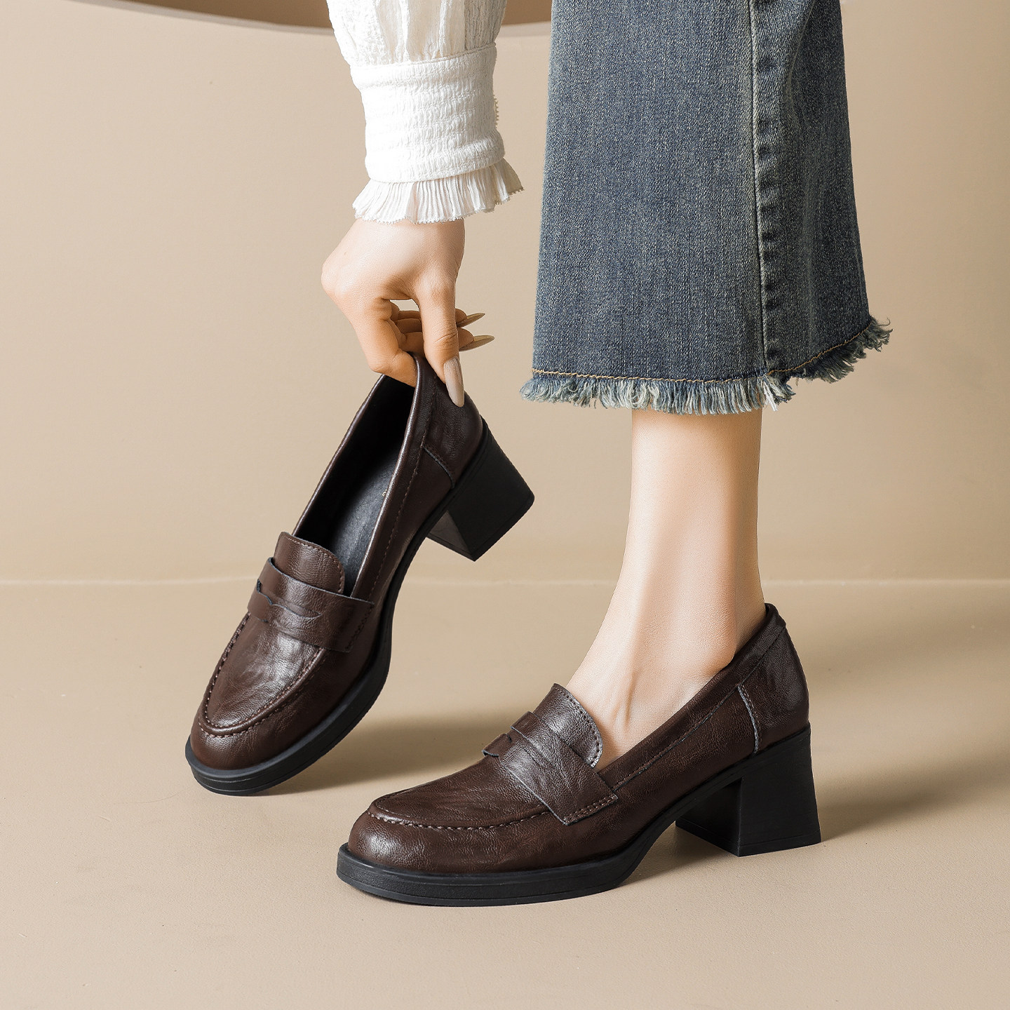 📚 羊皮版~粗跟乐福鞋女2026新款制服通勤单鞋棕色jk小皮鞋大码女鞋