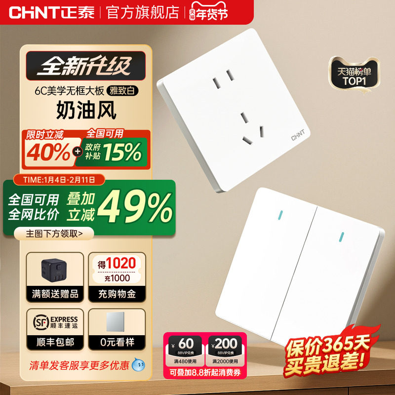 📚 正泰官方旗舰店开关插座家用暗装墙壁一开五孔面板多孔奶油风6C白