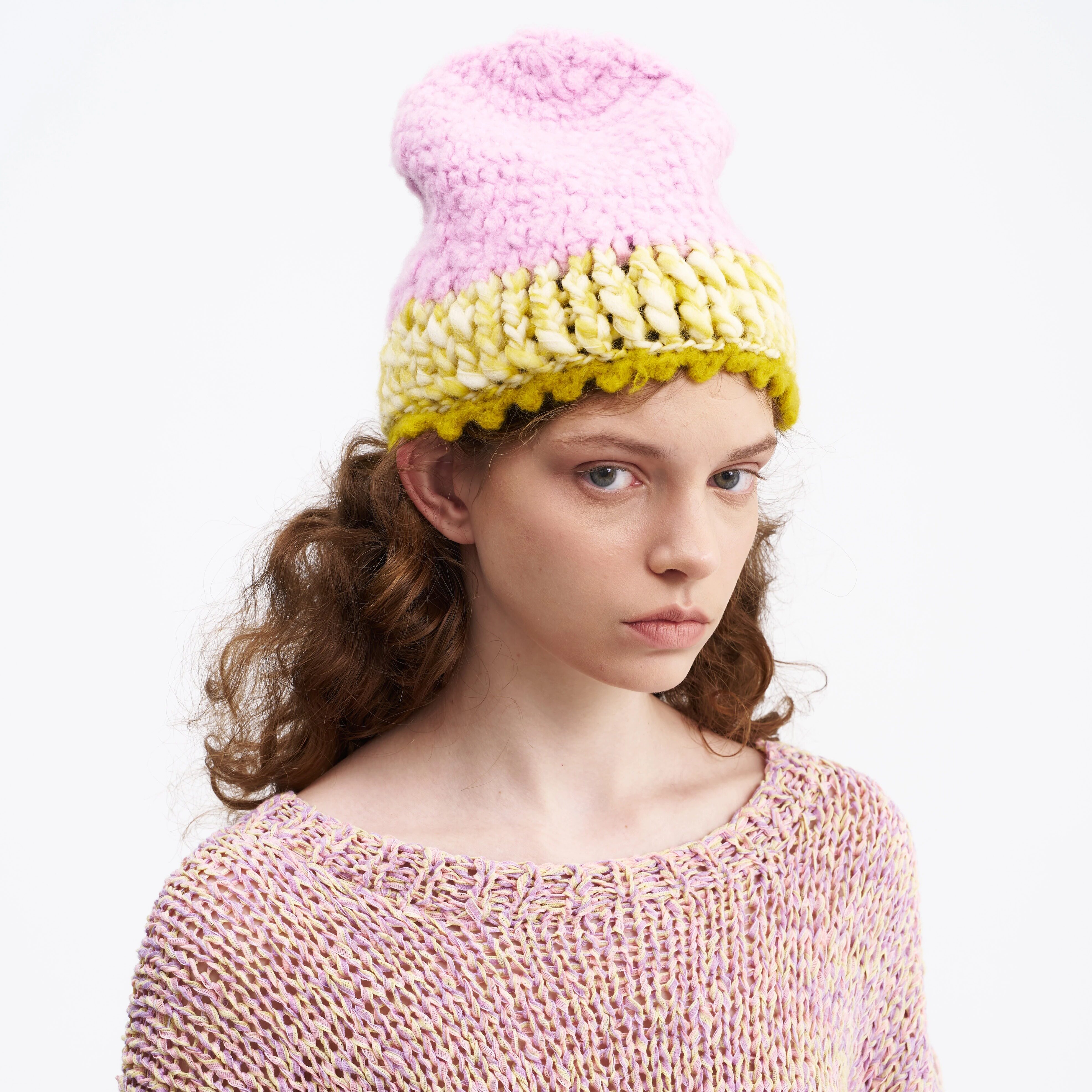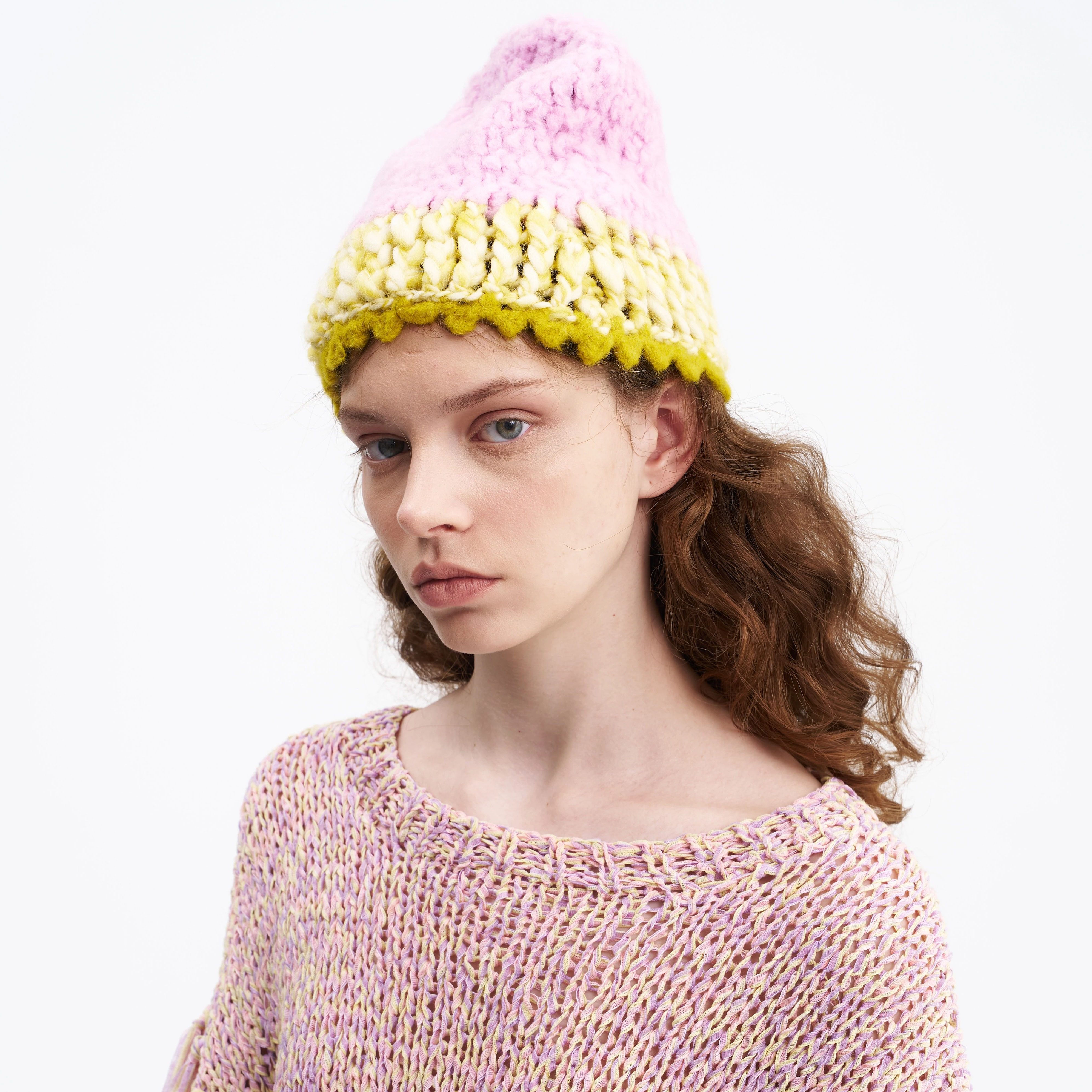 📚 【新品】SERY粉黄拼色针织手勾帽纯羊毛编织手工帽子保暖节日礼物