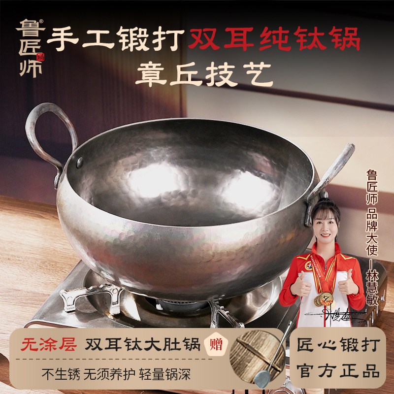 📚 鲁匠师纯手工钛锅纯钛双耳大肚无涂层家用炖汤炒菜锅非铁锅轻便