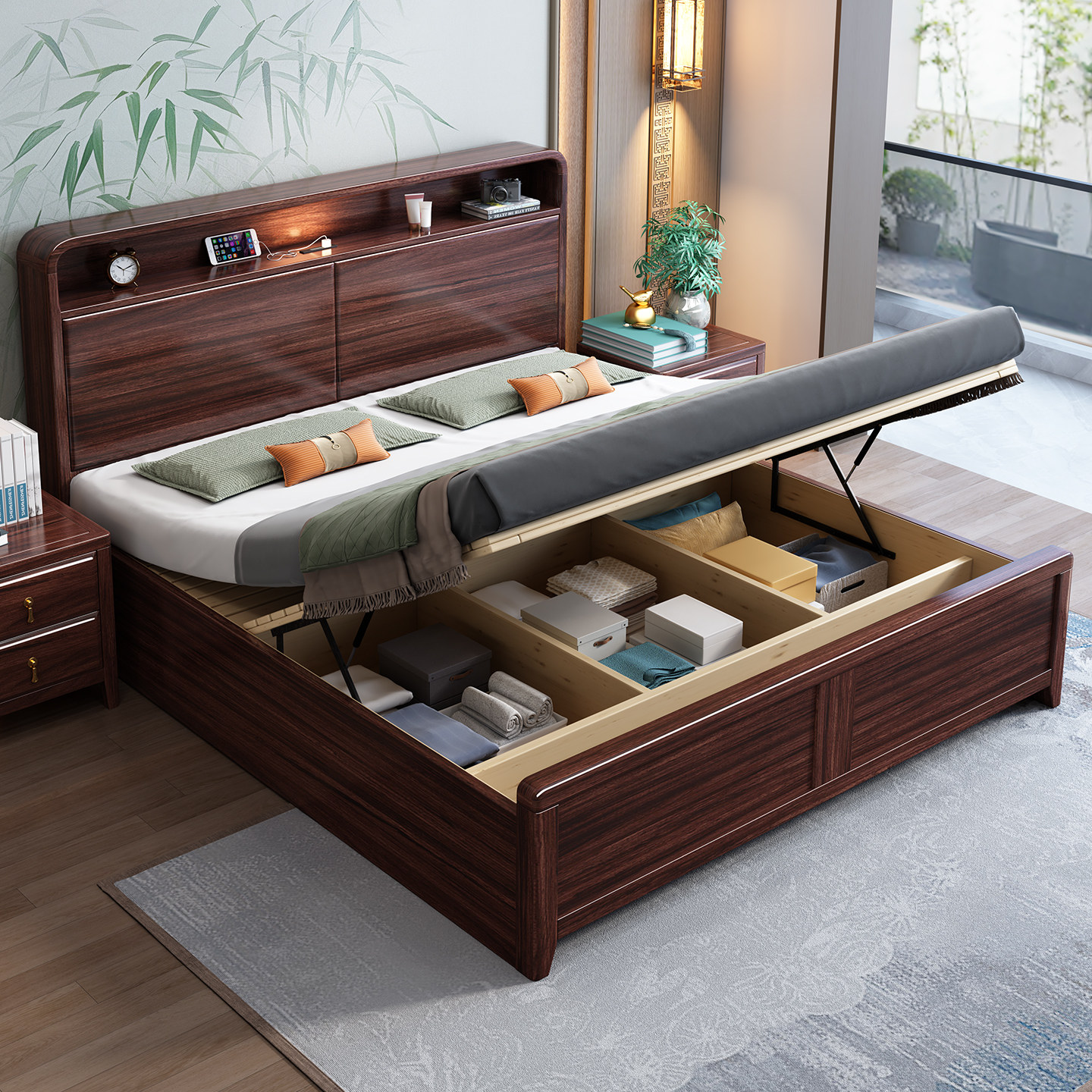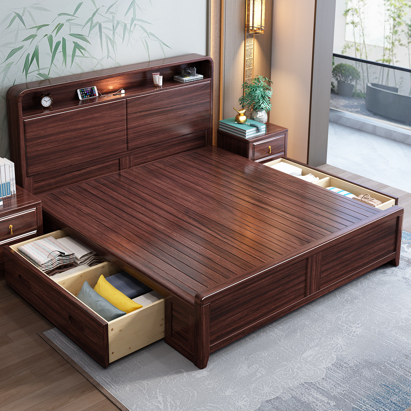 📚 新中式乌金木全实木床双人1.8米主卧现代简约双人床家用榫卯大床