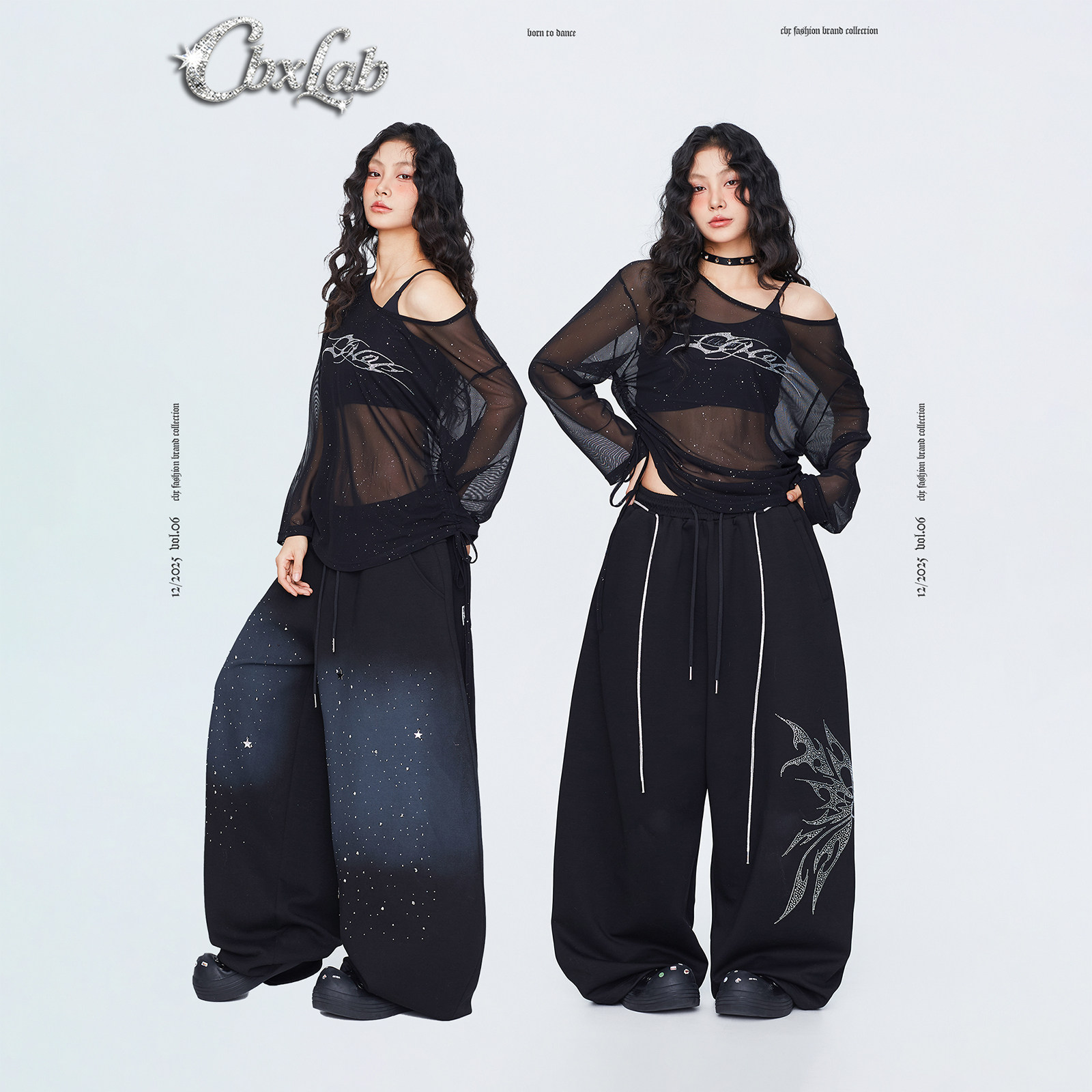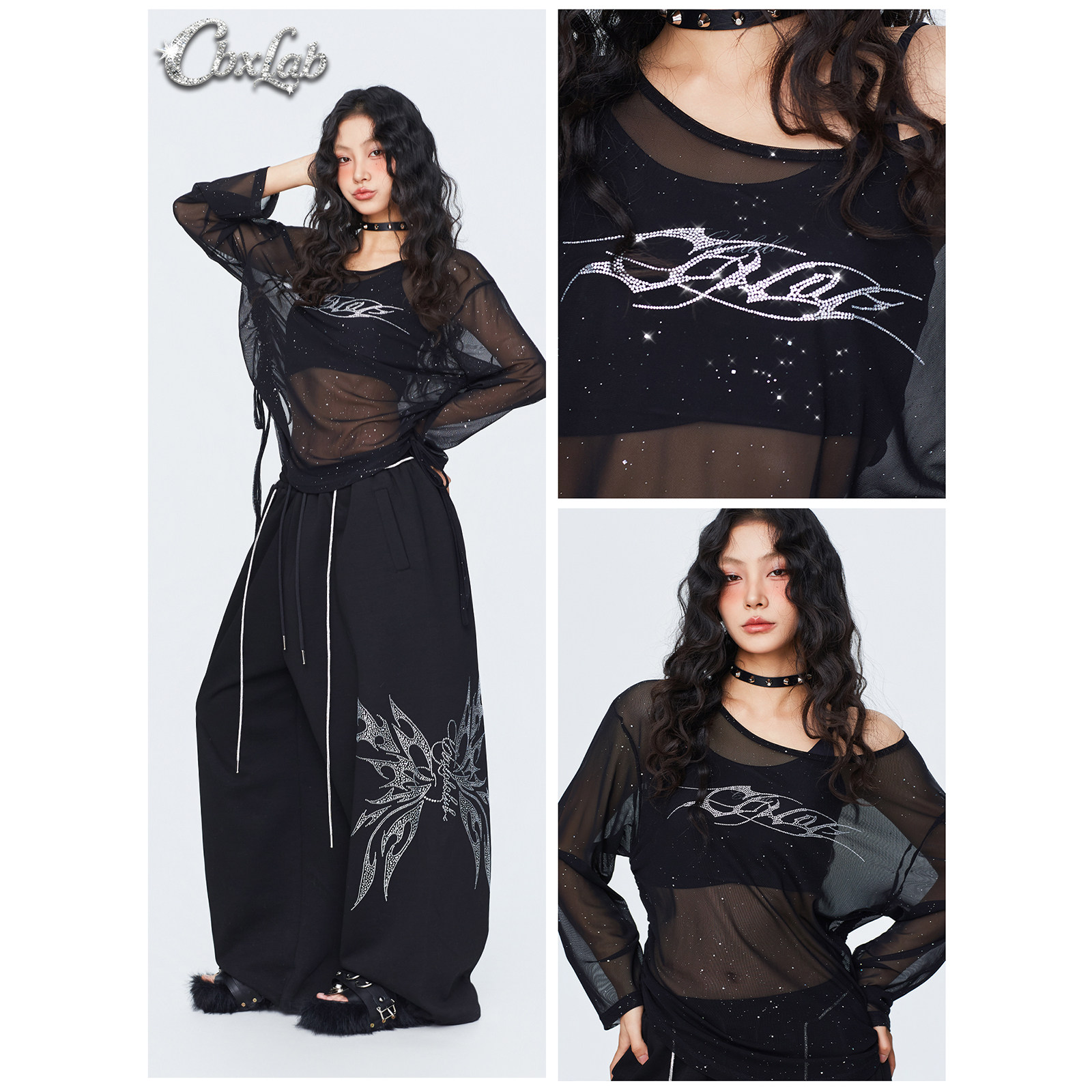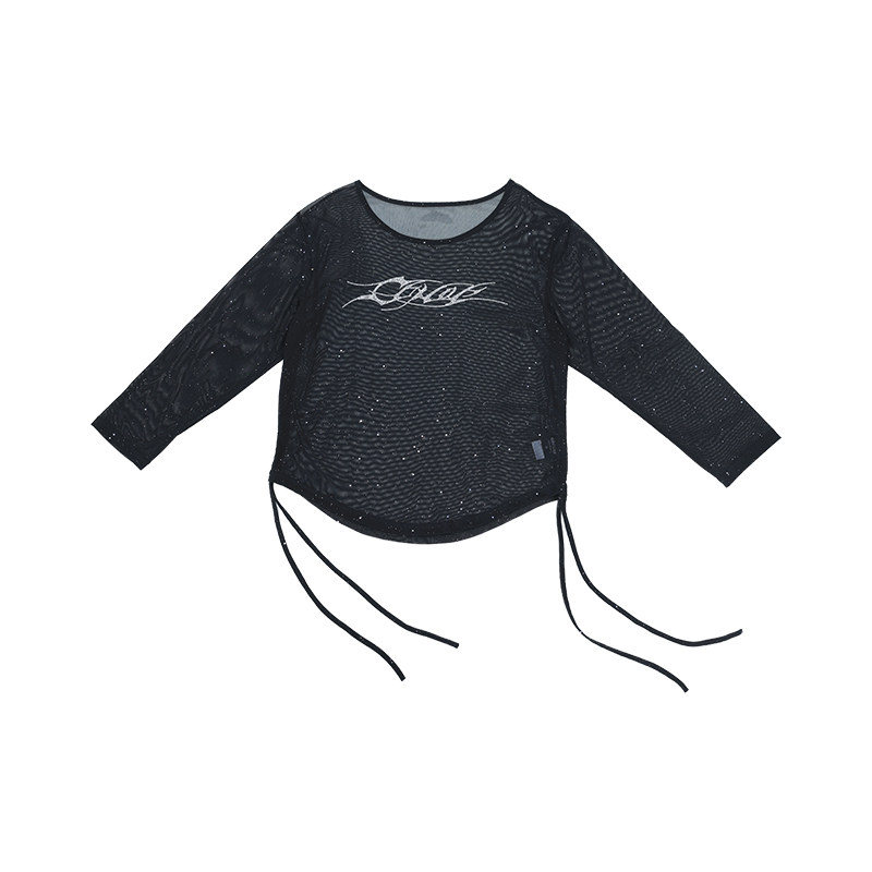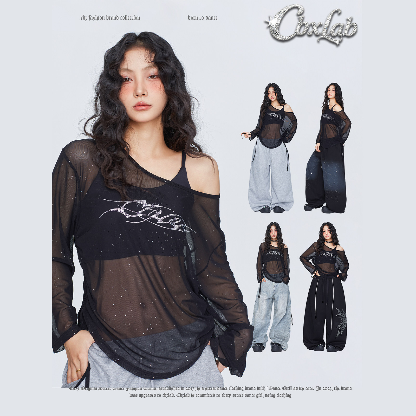 📚 CBXLAB街舞潮牌水光网纱微透抽褶闪银跳舞罩衫爵士辣妹微弹长袖女