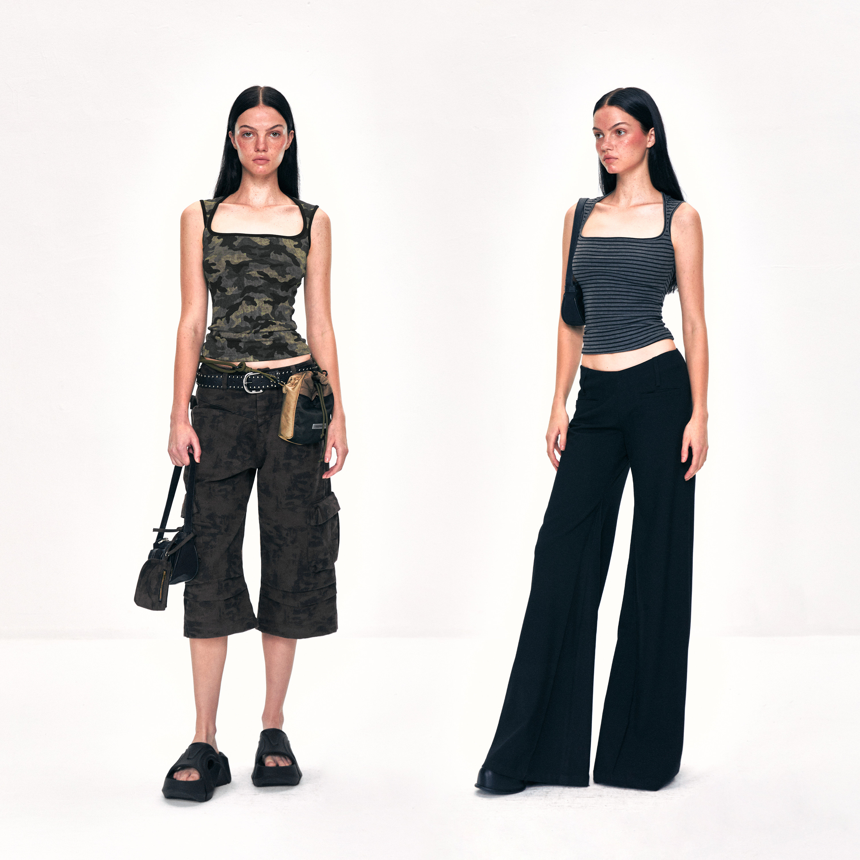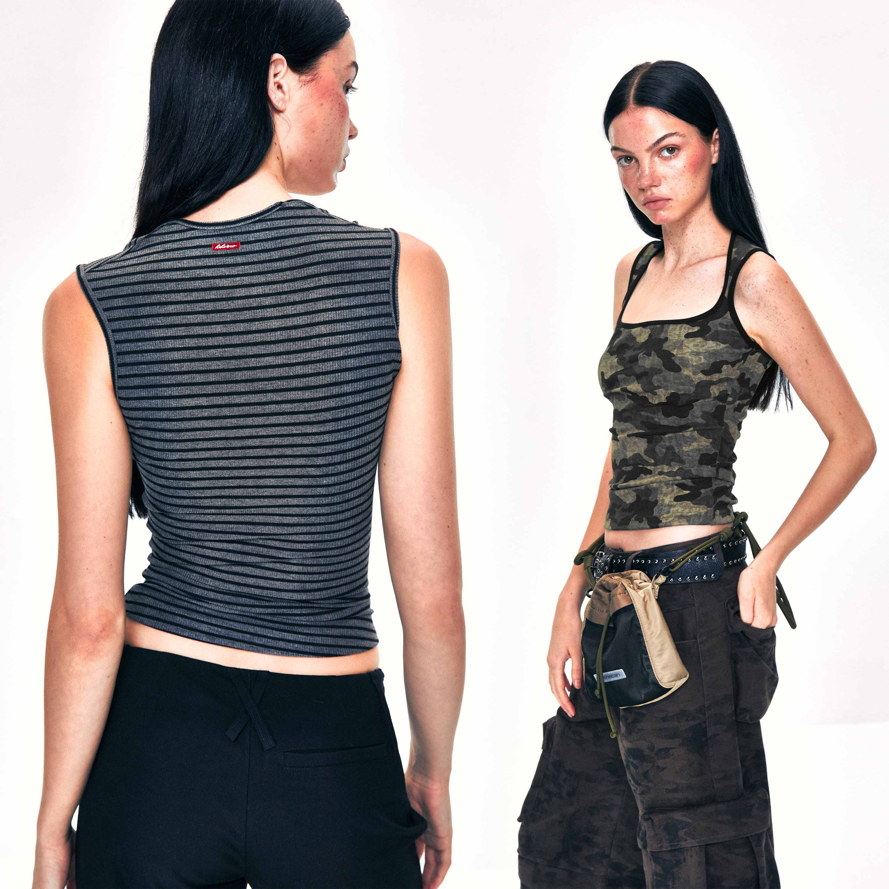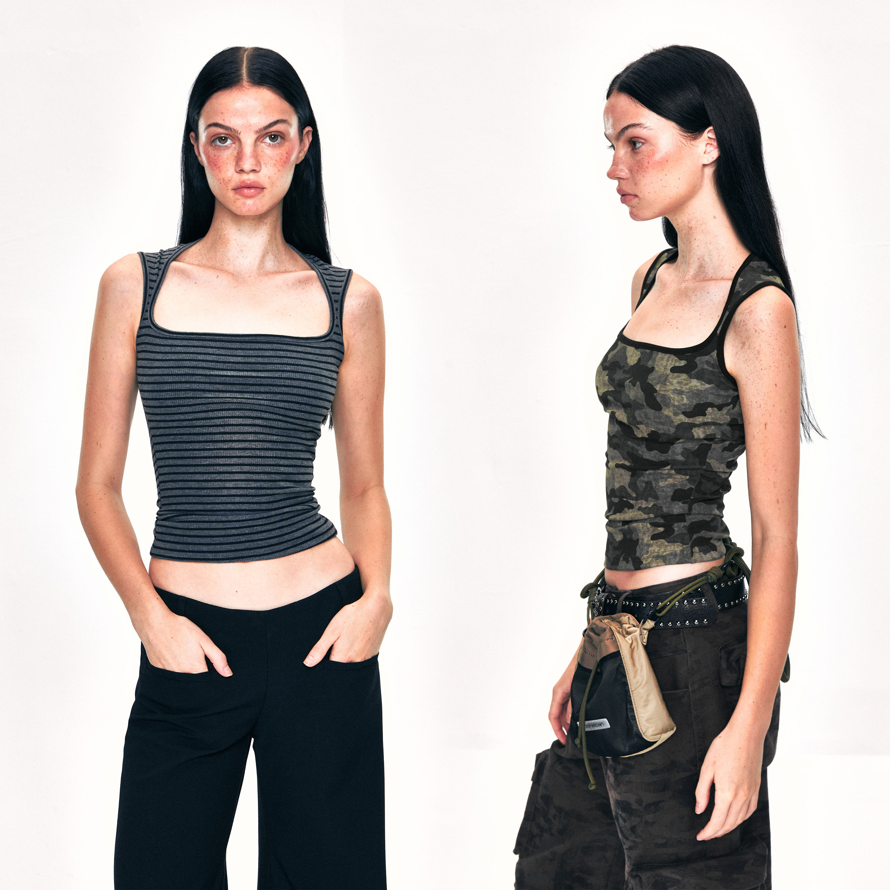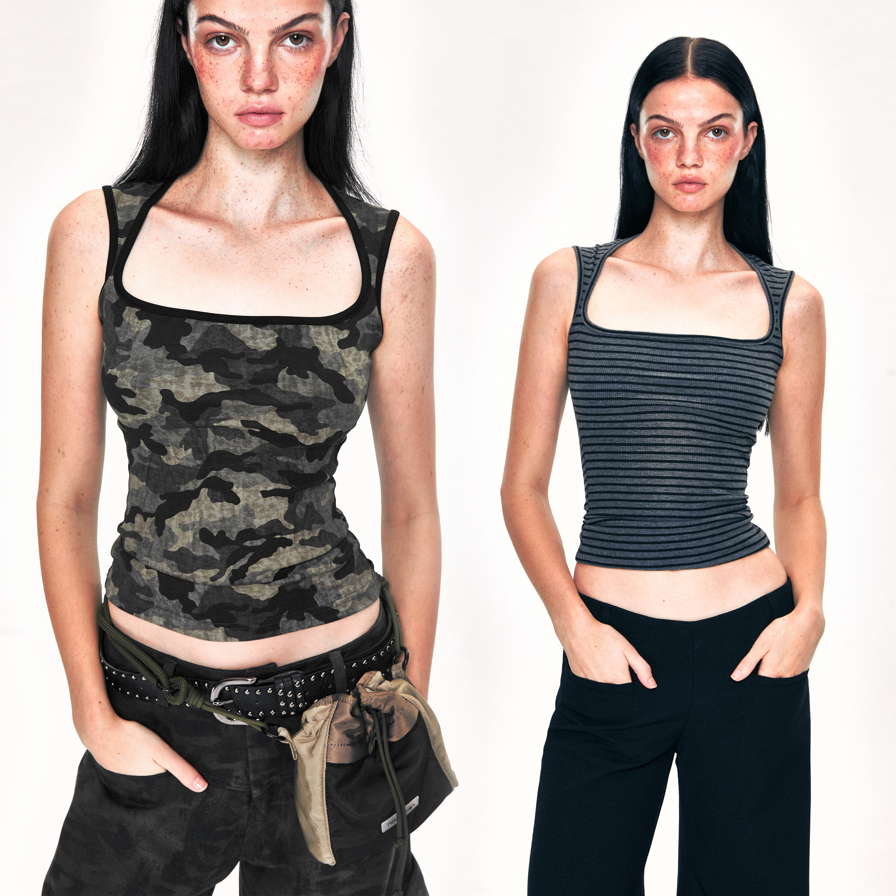 📚 KVKV 迷彩条纹宽肩带背心 复古辣妹性感紧身显瘦方领外穿吊带上衣