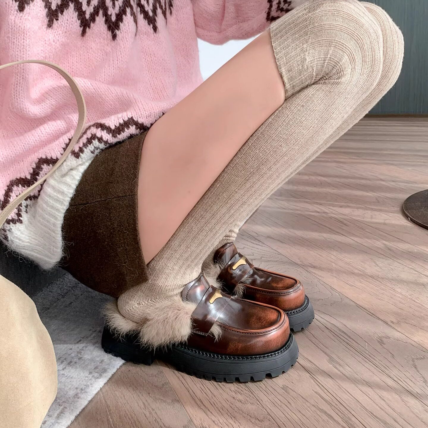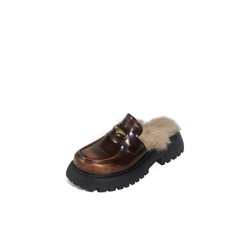 📚 5cm厚底包头半拖鞋女真皮大棉加绒穆勒鞋厚毛保暖金属扣懒人单鞋
