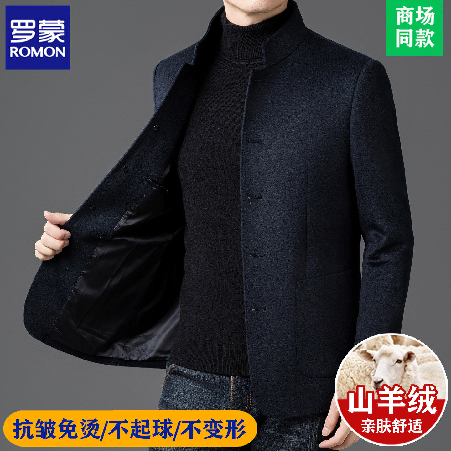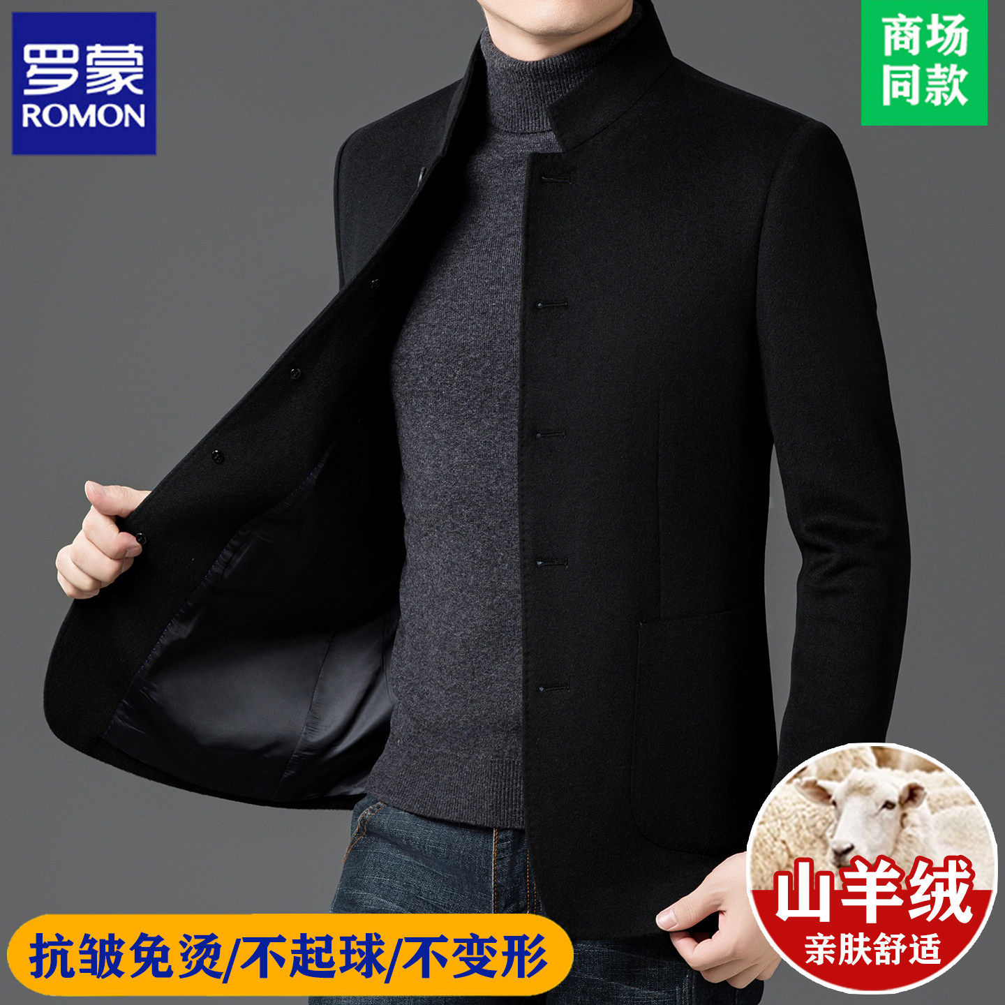 📚 罗蒙高端羊毛夹克男秋冬季双面呢中山装男士羊绒中式立领西服外套
