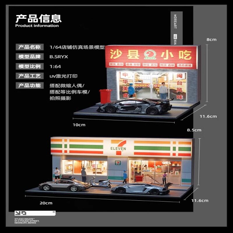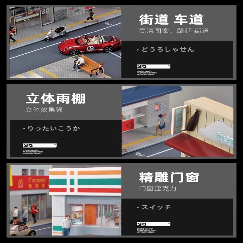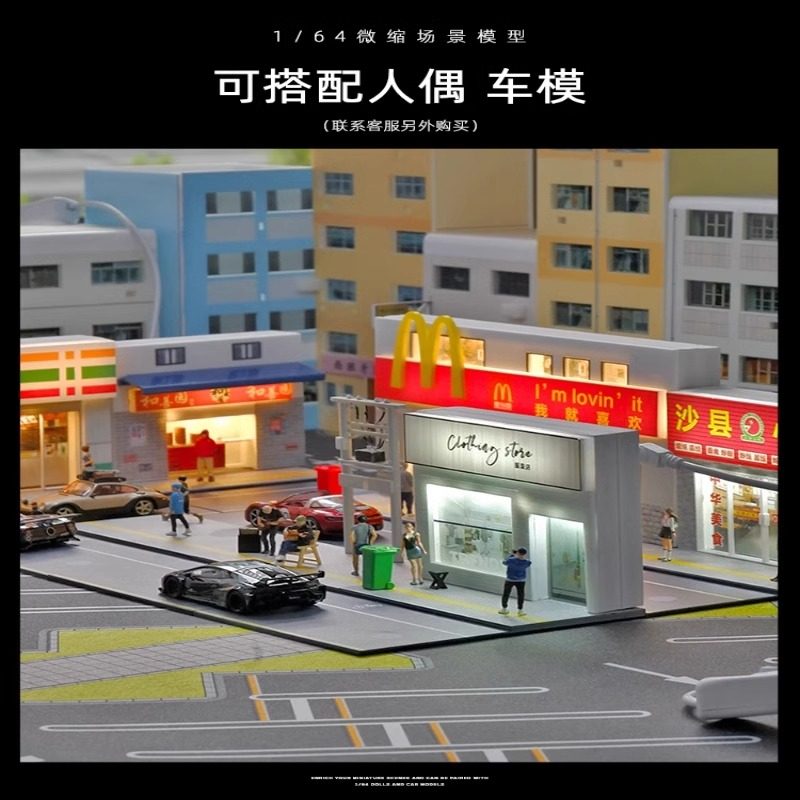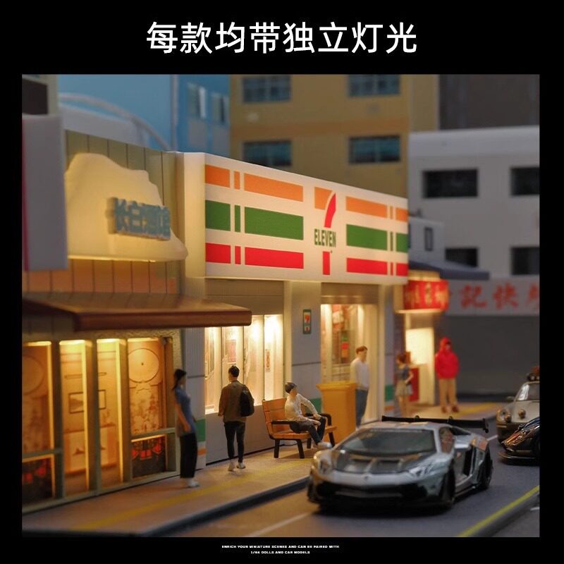 📚 仿真1:64小比例车场景模型建筑模型微缩摄影微观带灯711街景摆件
