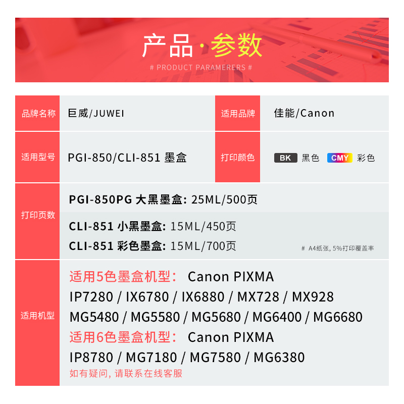 📚 适用佳能850 851墨盒IX6880 IX6780 IP7280 MX728 MX928打印机MG5480 MG5580 MG5680彩色MG6400 MG6680墨水匣