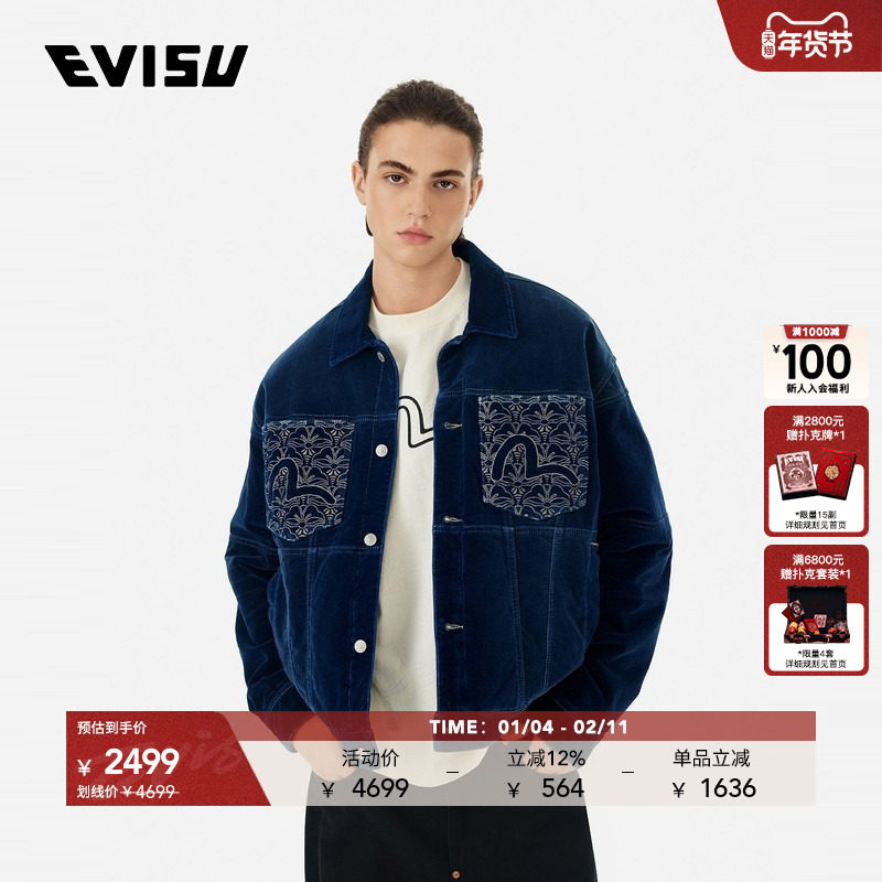 📚 EVISU 福神男士家花刺绣底特律绒面加厚牛仔夹克外套