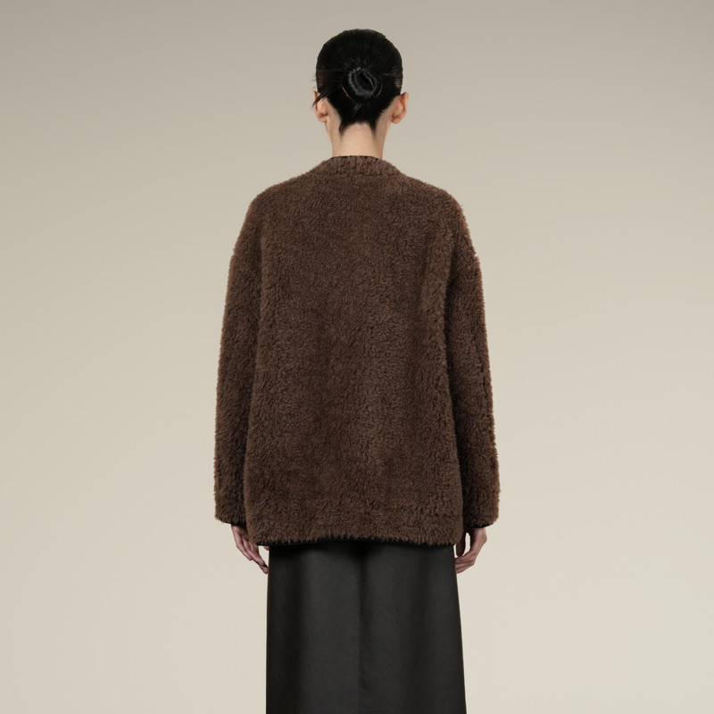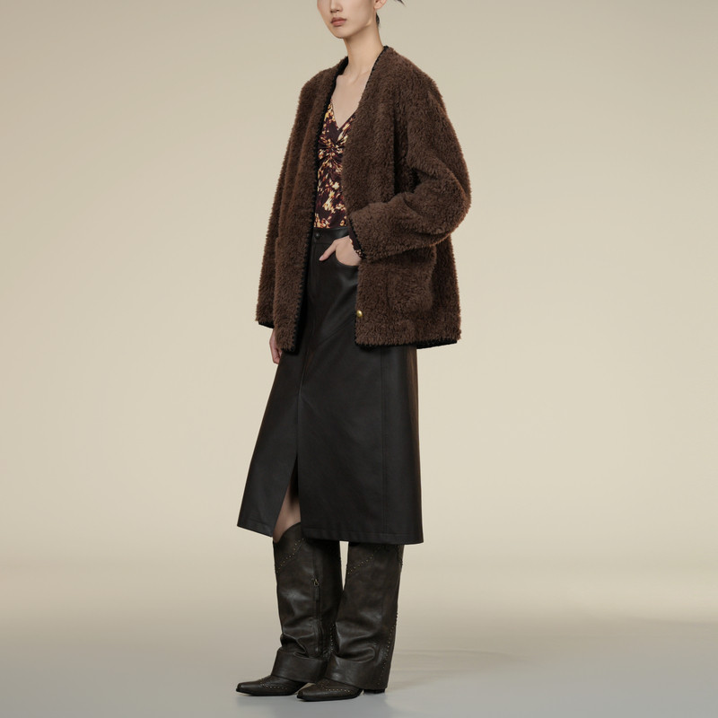 📚 XG雪歌厚款长袖纯绵羊毛外套2025冬季新款深棕色中长羊羔绒大衣女