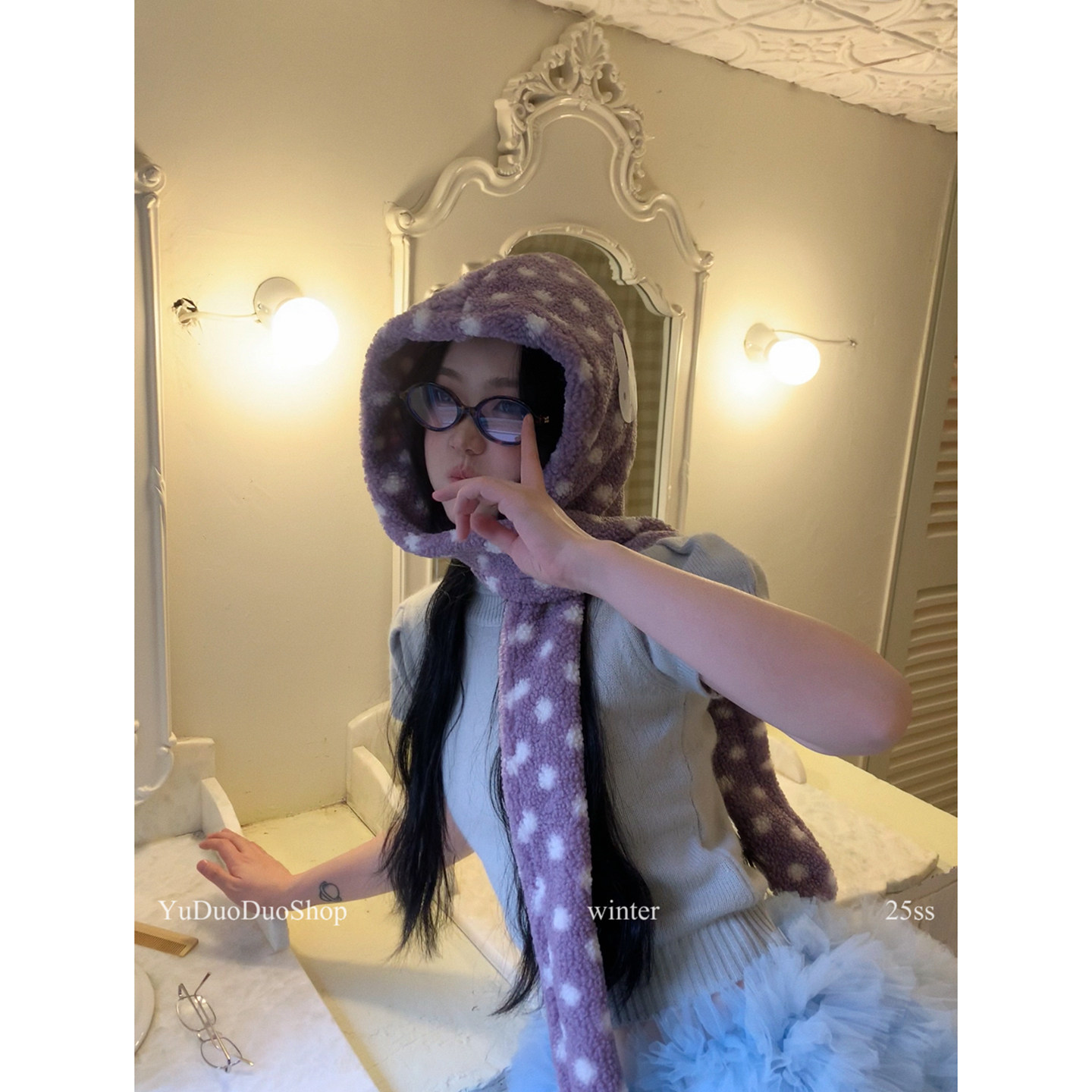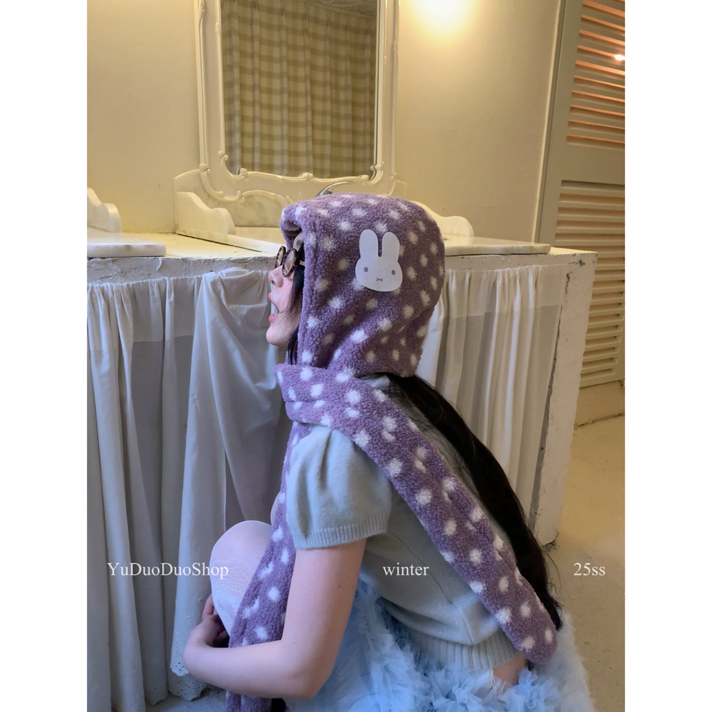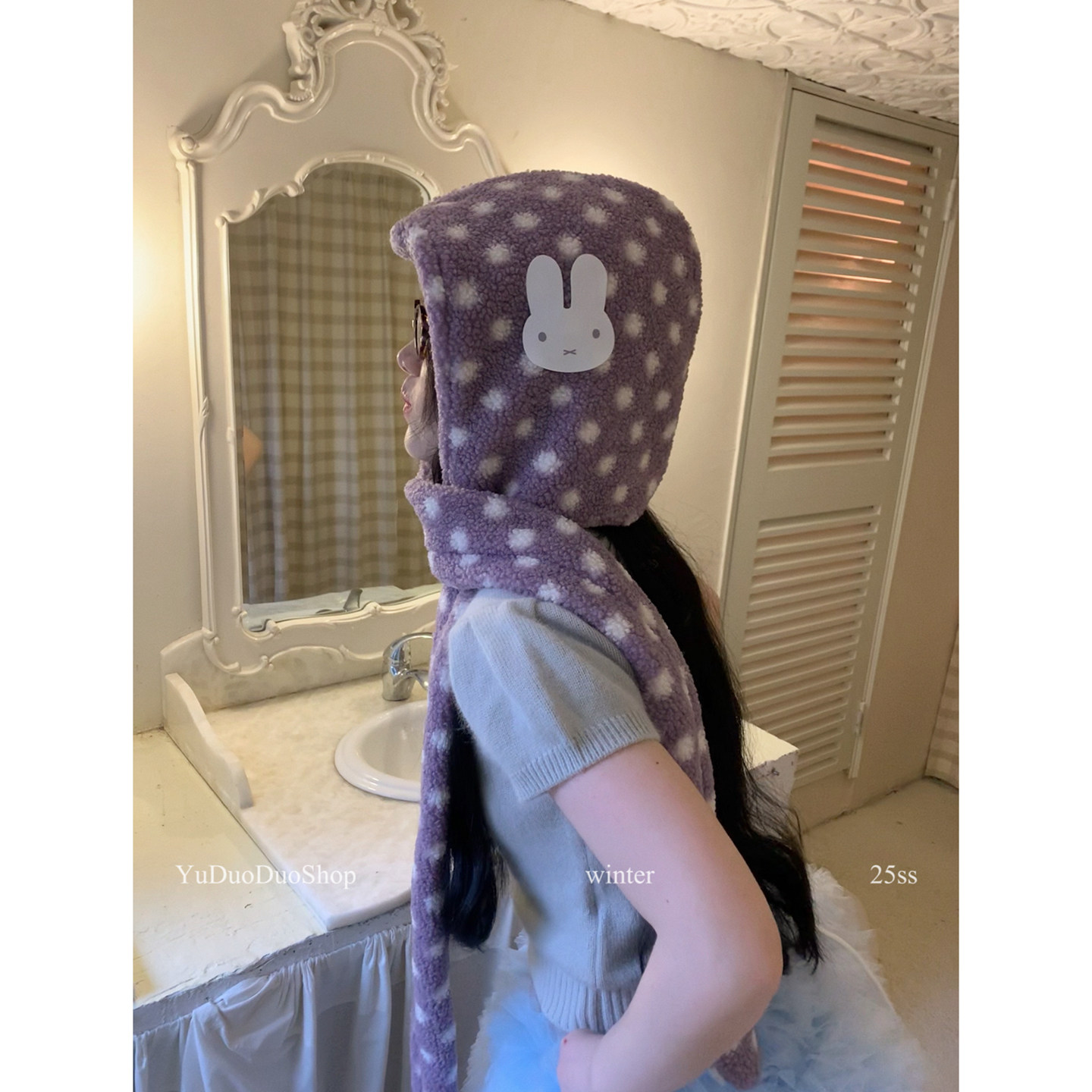 📚 可爱小兔子波点羊羔毛围巾帽子一体冬季保暖巴拉克拉法连帽围脖女