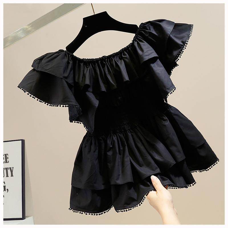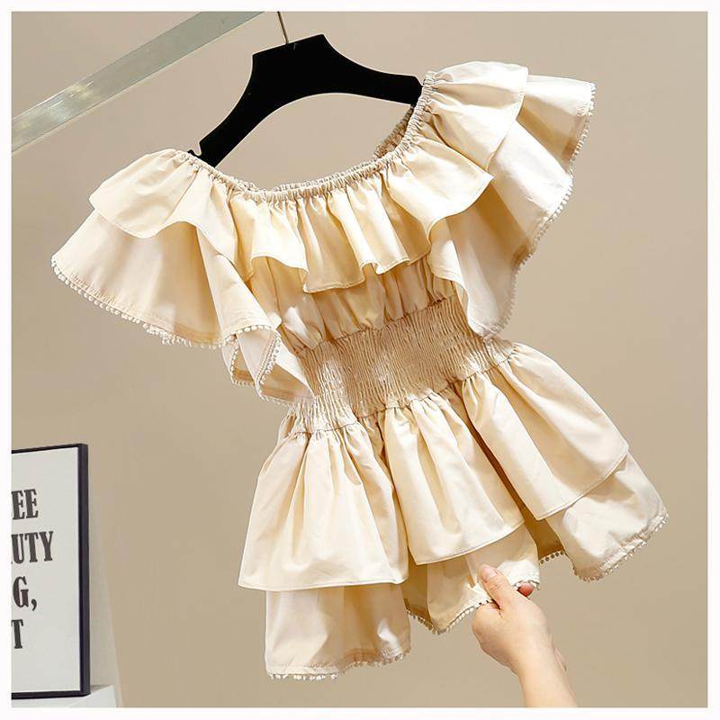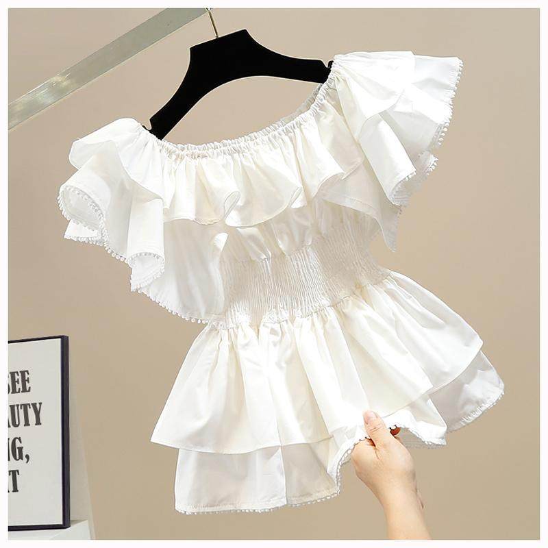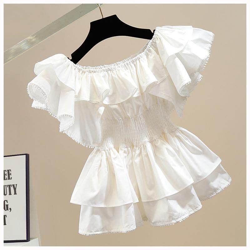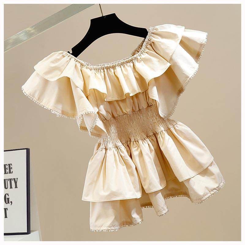 📚 时尚褶皱甜美荷叶边拼接一字领收腰显瘦套头衬衫女洋气百搭上衣潮