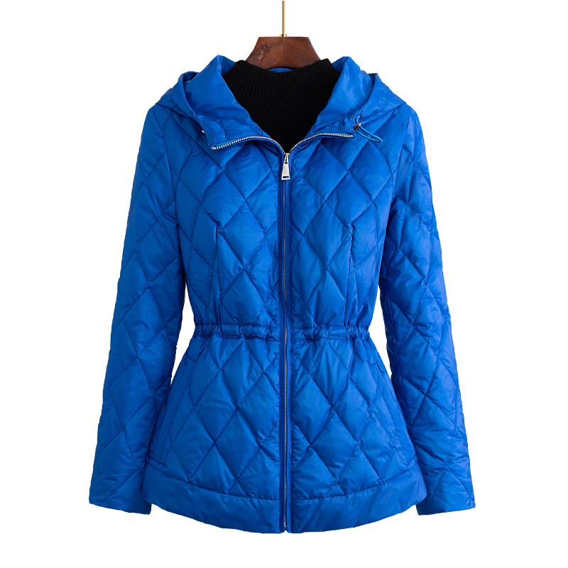 📚 高级宝石蓝连帽羽绒服外套女设计感抽绳收腰90白鸭绒羽绒衣2025冬