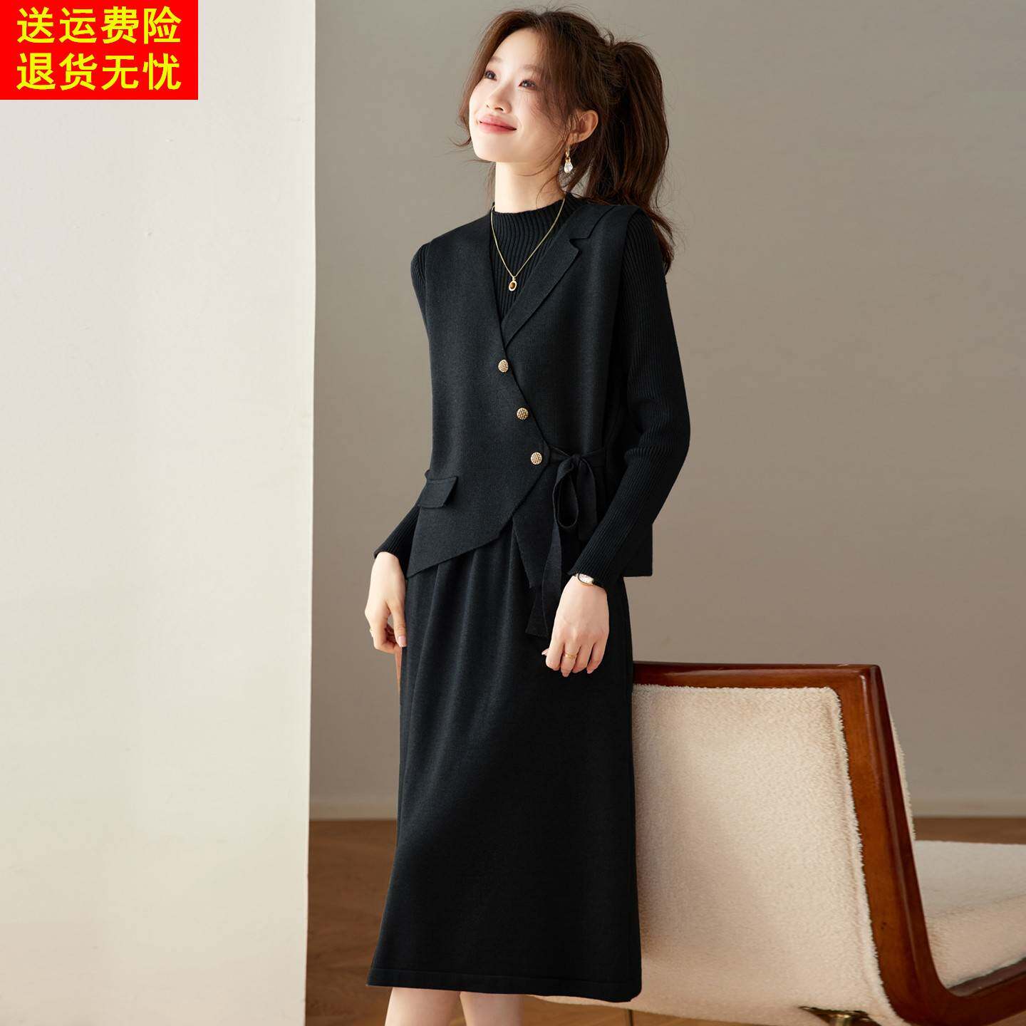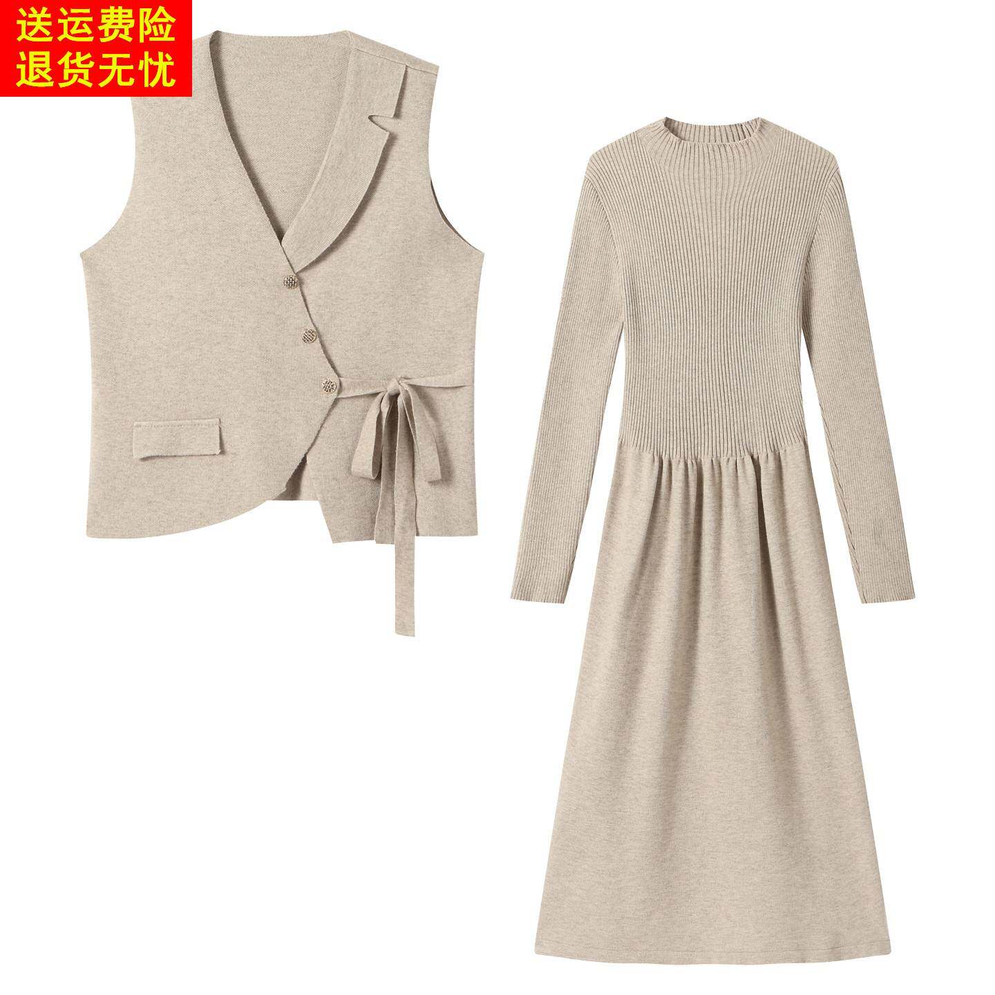📚 针织显瘦半高领连衣裙女过膝秋冬季新款长袖中领短款马甲两件套装