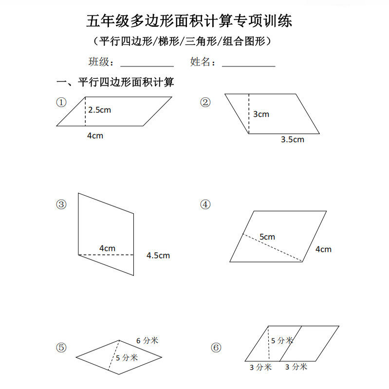 🎉“小学五年级多边形面积计算专项训练:平行四边形、梯形、三角形组合图形求阴影部分面积计算练习题作业本”🎉